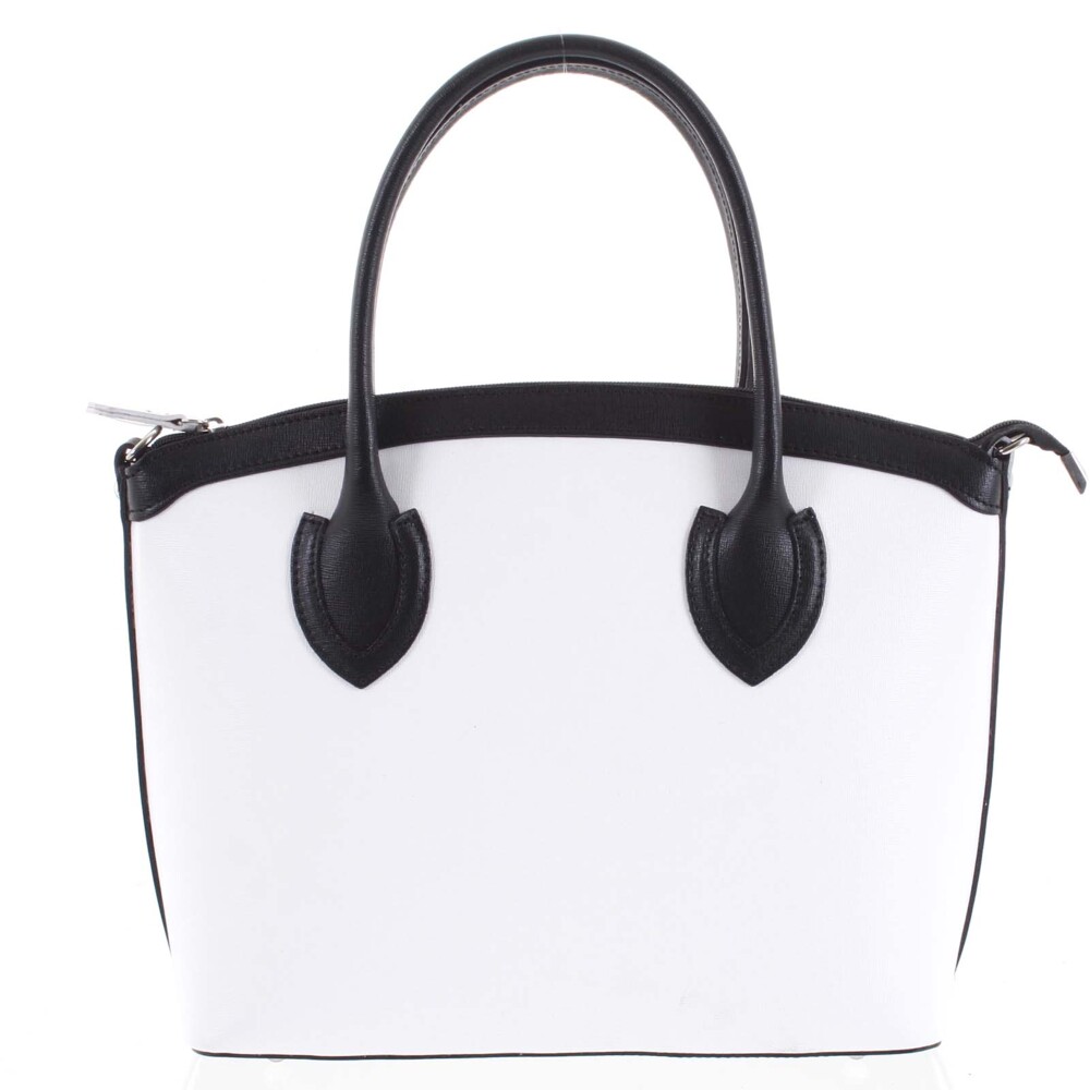 Luxusní kožený kousek z dílny značky ItalY. Krásná bílo černá kabelka do společnosti i do města. Elegantní kabelky s velmi žádaným vzorováním "saffiano". Kabelka je celkově pevná, pevné jsou i její uši a na spodní straně najdete kovové cvočky, které kabelku uchrání proti odření či ušpinění. Nosit ji můžete v ruce, na předloktí, ale i s popruhem přes rameno. Hlavní kapsa se otevře zipem po celé délce, vnitřní prostor je dělen přepážkou ve formě kapsy se zipem. Podšívka je kvalitní, látková a využít můžete i dalších malých kapsiček, například na telefon, klíče a kosmetiku. Design kabelky je udržen z obou stran.