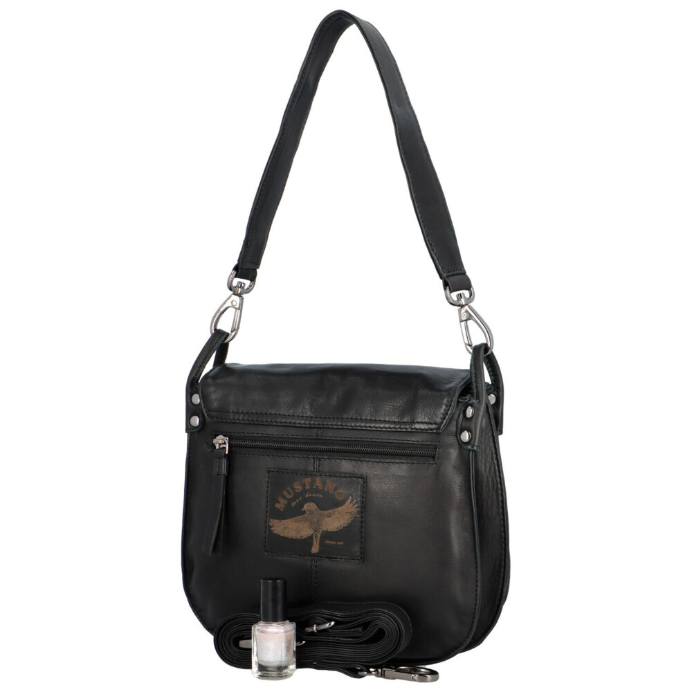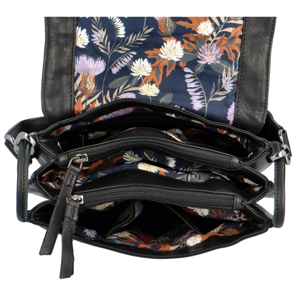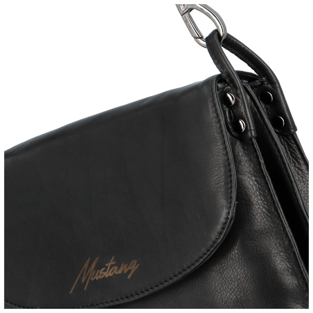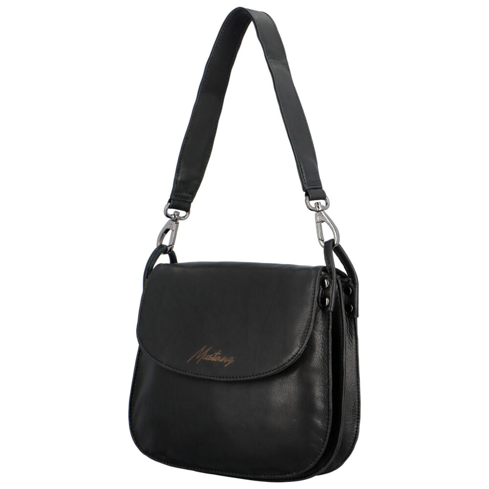 Luxusní dámská kožená kabelka z přírodní kůže značky Mustang. Kůže je jemná a příjemná na dotek. Kabelka je ve spodní části zaoblená, což dává kabelce její šmrnc. Kožené popruhy lze připnout dva - kratší, na nošení v ruce a přes rameno, nebo delší (nastavitelný), který poslouží k nošení do kříže a přes rameno. Poutka na držení popruhů jsou celokožené. Prostor kabelky je rozdělen na tři hlavní kapsy. Dělící části v sobě mají všité další dvě kapsy na zip. Poslední kapsu na zip najdete schovanou na zadní straně kabelky. Podšívka kabelky je z krásné květované látky. Přední i zadní stranu kabelky zdobí logo značky.