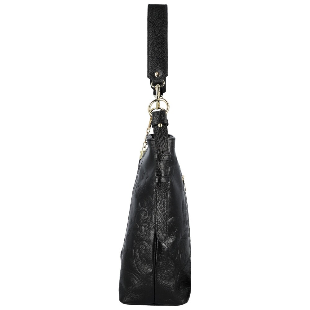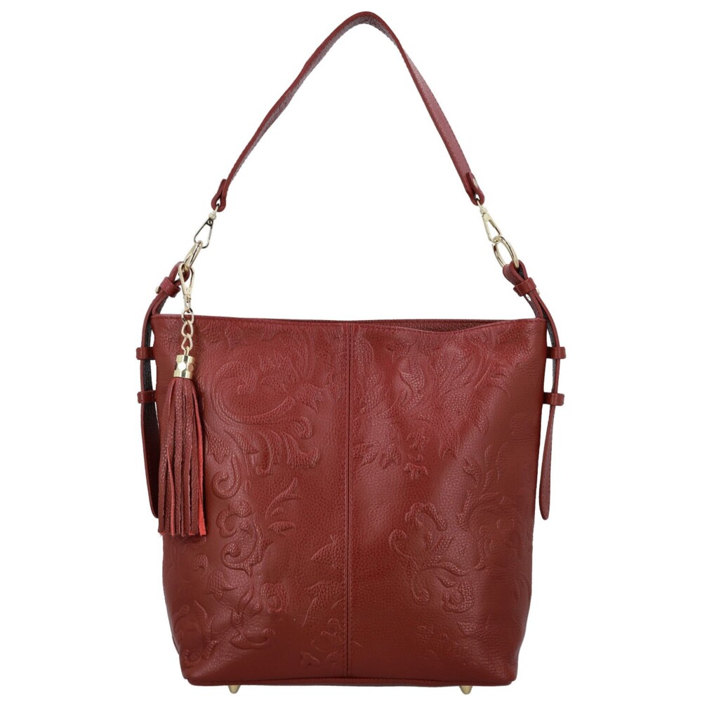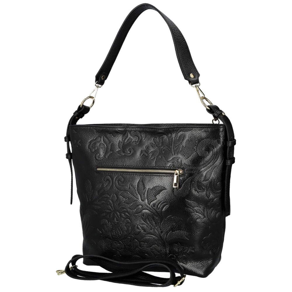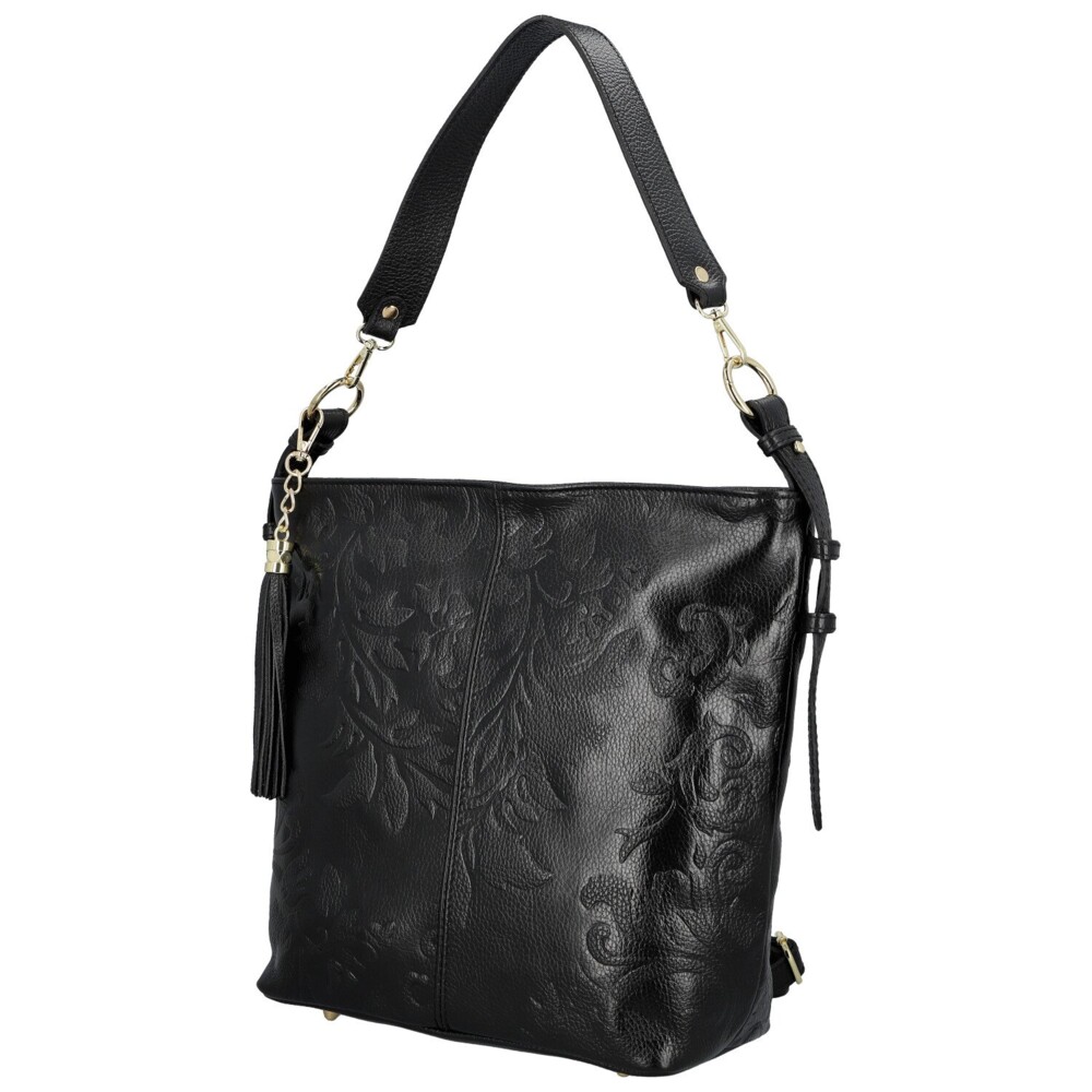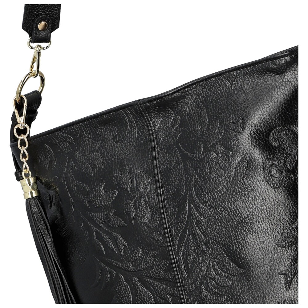 Stylová kožená kabelka na rameno, která zaujme svým originálním zpracováním i luxusním vzhledem. Povrch kabelky zdobí nádherný plastický reliéf s květinovým motivem, jenž jí dodává jedinečný šarm a umělecký nádech. Hlavní kapsa je uzavíratelná na zip a v podšívce ukrývá praktické kapsičky pro dokonalý přehled. Na zadní straně najdete další zipovou kapsu na drobnosti. Kabelka má dva popruhy - kratší pro elegantní nošení na ramenní a delší, nastavitelný, který můžete snadno připnout podle potřeby. Doplňuje ji zlaté kování a ozdobný střapec, které podtrhují její sofistikovaný vzhled. Objednejte ještě dnes a vyzkoušejte, vrátit ji můžete až za 30 dnů!