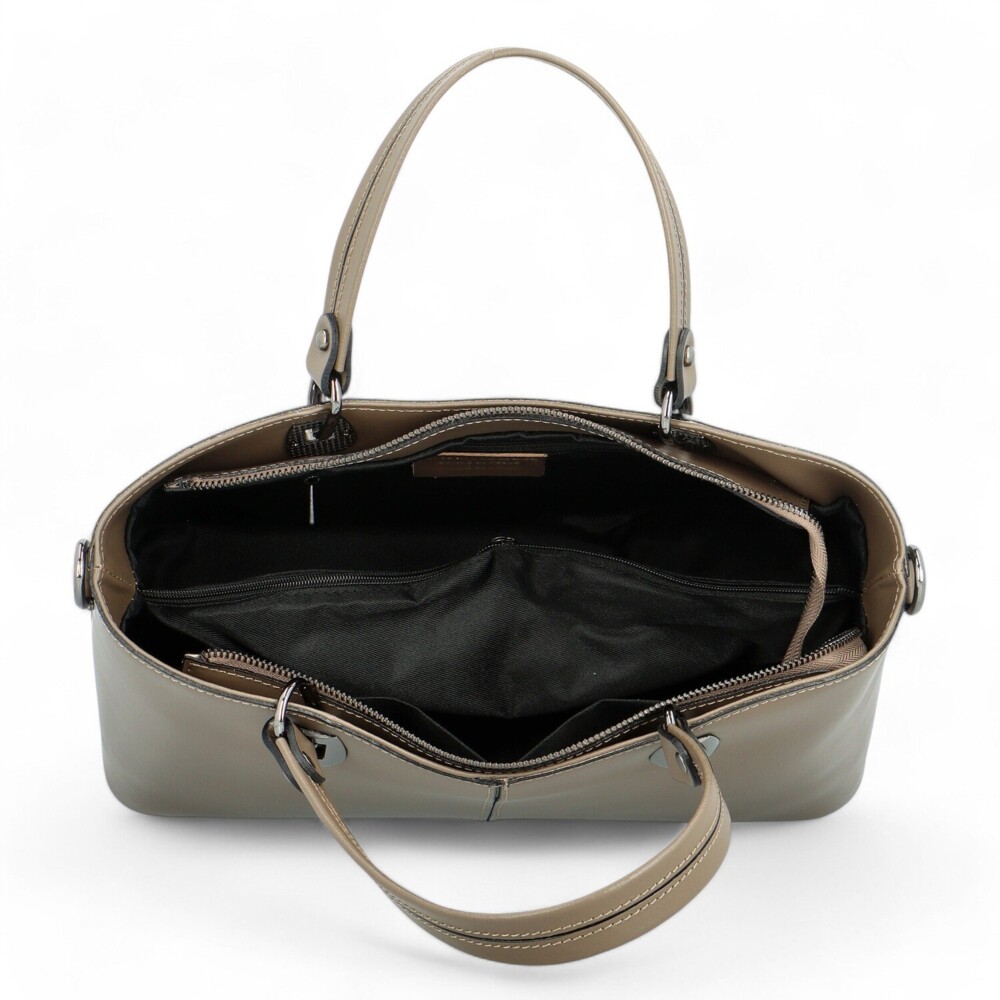 Luxusní, pevná, taupe, dámská, kožená kabelka do ruky, od značky Delami. Novinka. Objednejte ještě dnes a vyzkoušejte, vrátit ji můžete až za 30 dnů! Tuto krásnou kabelku můžete nosit opravdu kamkoliv. Jde o módní, moderní a jedinečný kousek do města, do práce, do společnosti. Kůže kabelky je hladká, matná. Ke kabelce lze připojit popruh, tak ji můžete nosit i přes rameno. Spodní strana tašky disponuje kovovými cvoky, ty zajišťují stabilitu a to, že se kabelka jen tak neodře. Hlavní kapsa se otevírá zipem.