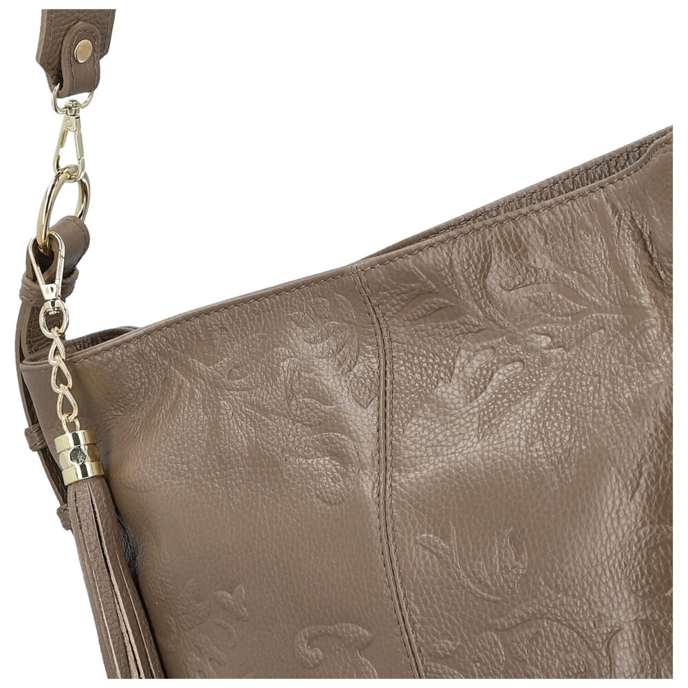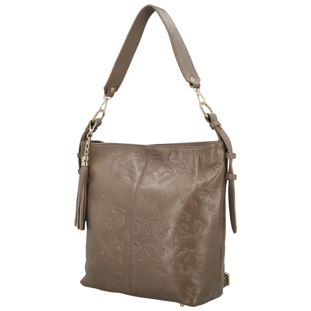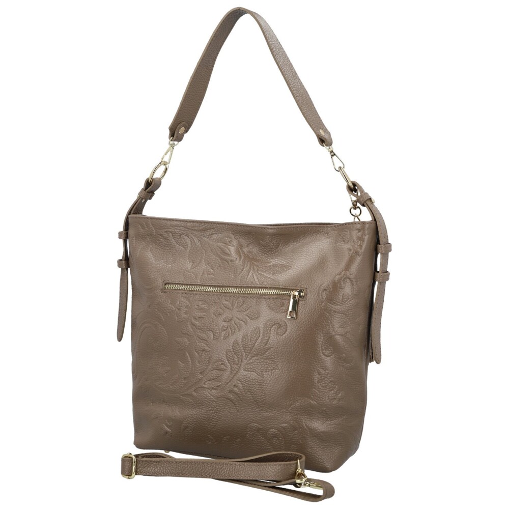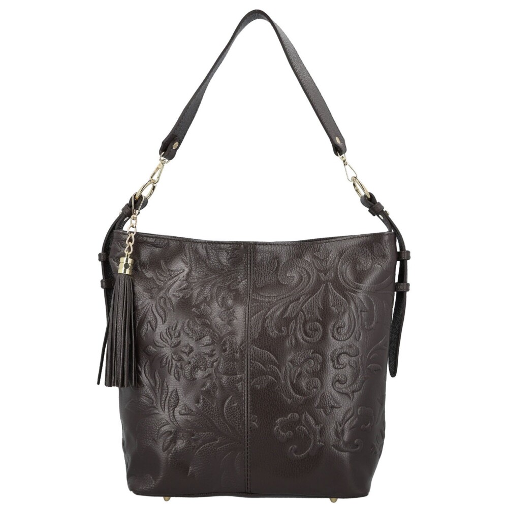 Stylová kožená kabelka na rameno, která zaujme svým originálním zpracováním i luxusním vzhledem. Povrch kabelky zdobí nádherný plastický reliéf s květinovým motivem, jenž jí dodává jedinečný šarm a umělecký nádech. Hlavní kapsa je uzavíratelná na zip a v podšívce ukrývá praktické kapsičky pro dokonalý přehled. Na zadní straně najdete další zipovou kapsu na drobnosti. Kabelka má dva popruhy - kratší pro elegantní nošení na ramenní a delší, nastavitelný, který můžete snadno připnout podle potřeby. Doplňuje ji zlaté kování a ozdobný střapec, které podtrhují její sofistikovaný vzhled. Objednejte ještě dnes a vyzkoušejte, vrátit ji můžete až za 30 dnů!