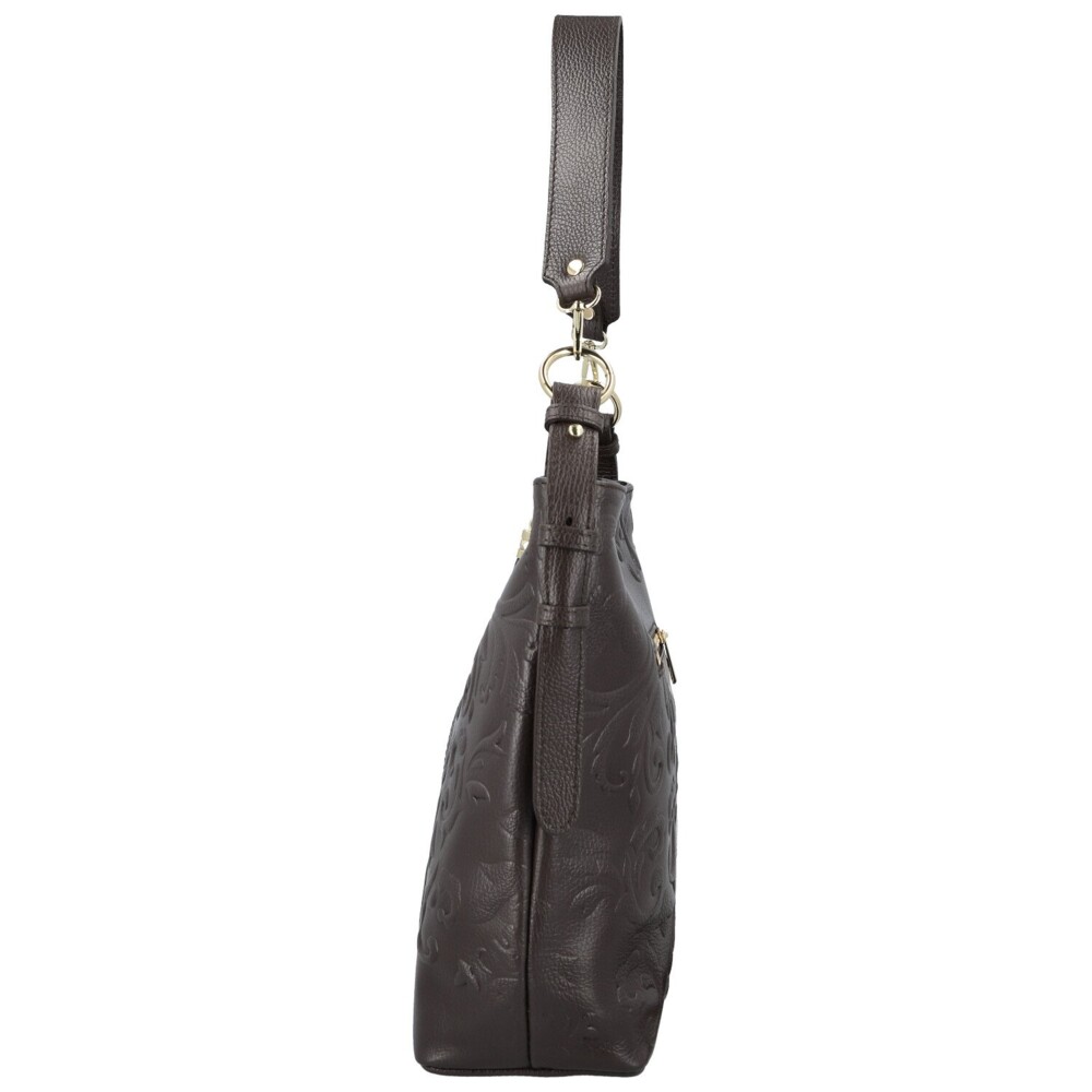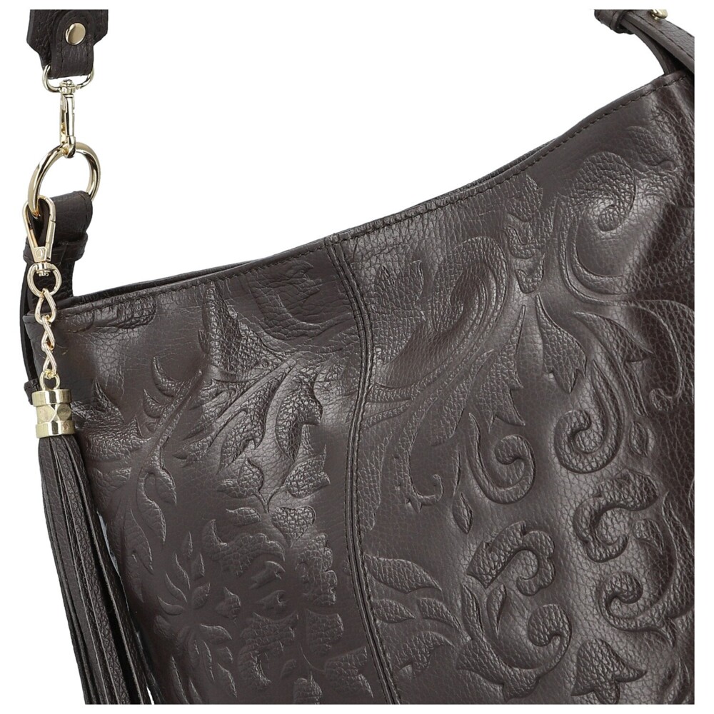 Stylová kožená kabelka na rameno, která zaujme svým originálním zpracováním i luxusním vzhledem. Povrch kabelky zdobí nádherný plastický reliéf s květinovým motivem, jenž jí dodává jedinečný šarm a umělecký nádech. Hlavní kapsa je uzavíratelná na zip a v podšívce ukrývá praktické kapsičky pro dokonalý přehled. Na zadní straně najdete další zipovou kapsu na drobnosti. Kabelka má dva popruhy - kratší pro elegantní nošení na ramenní a delší, nastavitelný, který můžete snadno připnout podle potřeby. Doplňuje ji zlaté kování a ozdobný střapec, které podtrhují její sofistikovaný vzhled. Objednejte ještě dnes a vyzkoušejte, vrátit ji můžete až za 30 dnů!
