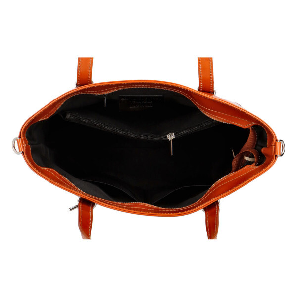 Velká luxusní kabelka z hovězí usně. Elegantní dámský doplněk od značky Delami Vera Pelle, který lze nosit přes rameno za ucho nebo s popruhem. Této pevné krásce neodoláte! Novinka. Objednejte ještě dnes a vyzkoušejte, vrátit ji můžete až za 30 dnů! Kabelka je hladká, s kapsou na zip na přední straně. Spodní strana kabelky disponuje kovovými cvoky, je tak díky své pevnosti skvěle stabilní. Hlavní kapsa se otevírá zipem, uvnitř najdete tři volné kapsičky na telefon, kapesníčky a další drobnosti a látkovou kapsu se zipem na cennosti.