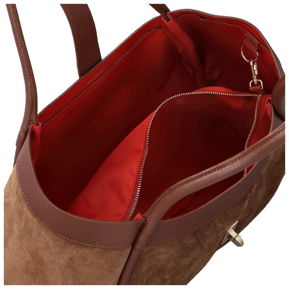 Tato luxusní kožená kabelka na rameno vyniká svým elegantním tvarem a promyšleným designem. Přední část zdobí tenký kožený proužek se zlatým zámkem, který nejen působí stylově, ale zároveň zajišťuje hlavní kapsu. Po jeho rozepnutí se odhalí prostorný interiér s vyjímatelným organizérem na zip, díky němuž zůstane uvnitř vše dokonale uspořádané. Kabelka má pevná ucha pro pohodlné nošení na rameni a doplňuje ji odnímatelný, nastavitelný kožený popruh, který nabízí volnost a pohodlí. Kombinace broušené a hladké kůže dodává modelu sofistikovaný vzhled a jedinečný charakter - ideální pro ženy, které milují styl, funkčnost a kvalitu v jednom. Objednejte ještě dnes a vyzkoušejte, vrátit ji můžete do 30ti dnů!