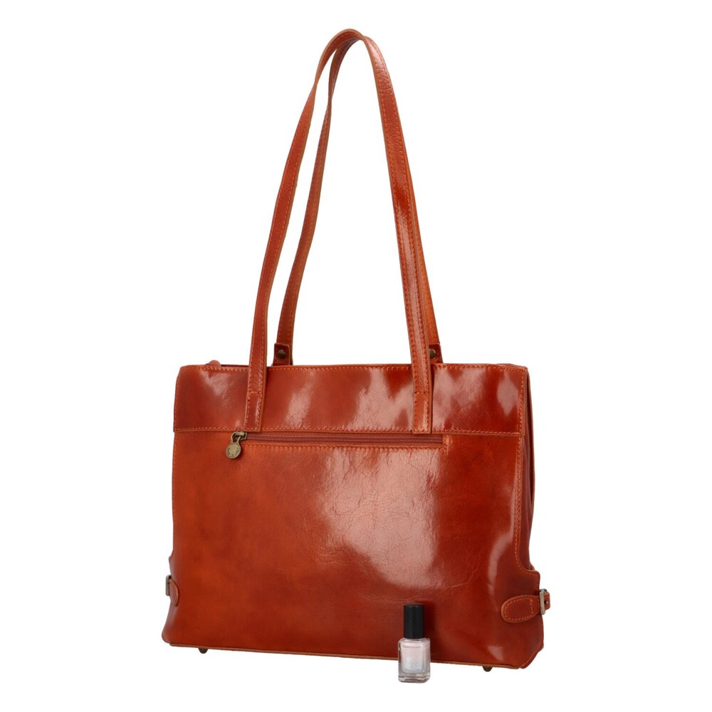Módní kožená kabelka v pevném tvaru z hovězí kůže, která podtrhne váš jedinečný styl. Kožené kousky jsou ty nejkvalitnější, proto jsou tou správnou volbou. Kabelka má velkou hlavní kapsu na zip. Uvnitř je prostor rozdělený velkou středovou kapsou na zip z podšívky. Uvnitř nechybí postranní přihrádky na drobnosti i menší kapsa na zip. Zadní část také nabízí praktickou kapsu na zip, pro uložení třeba klíčů. Uši jsou pevné a dlouhé pro pohodlné nošení jak na rameni, tak v ruce. Po bocích jsou ozdobné pásky na stáhnutí a spodní díl má nožičky proti poškrábání tašky. Přední stranu zdobí stylové logo značky. Přírodní materiál Vám zaručí stálost tohoto kousku a mosazná barva kování umocní styl kabelky. Tak objednejte ještě dnes a vyzkoušejte, vrátit ji můžete do 30ti dnů.