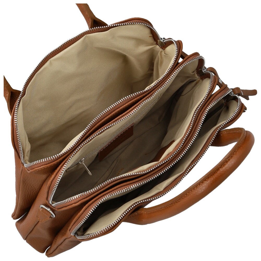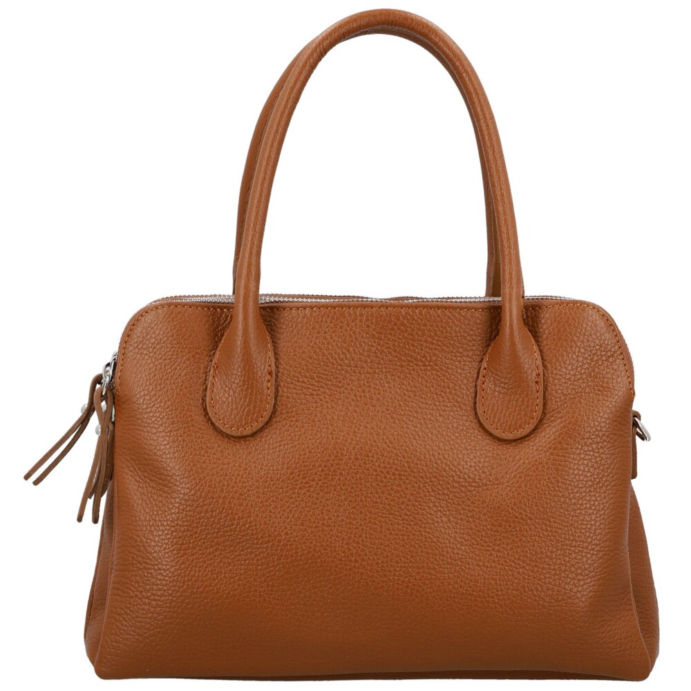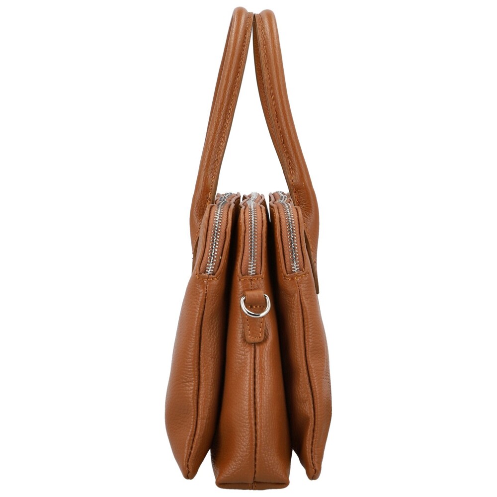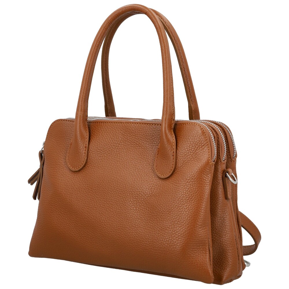 Nadčasová dámská kabelka z pravé kůže, která zaujme svou elegantní jednoduchostí a dokonale vyváženým tvarem. Její design je z obou stran stejný, což jí dodává harmonický a čistý vzhled. Uvnitř se skrývá hned tři samostatné hlavní kapsy, každá uzavíratelná na zip. Ideální pro ženy, které milují pořádek a přehled. V podšívce nechybí praktické kapsičky pro drobnosti. Kabelka má pevná ucha pro pohodlné nošení v ruce a zároveň je vybavena dlouhým, nastavitelným popruhem, který snadno připnout pro nošení přes rameno. Stříbrné kování dodává celku jemný lesk a podtrhuje její elegantní styl. Univerzální kousek s nádechem luxusu a ženskosti. Objednejte ještě dnes a vyzkoušejte, vrátit ji můžete do 30ti dnů!
