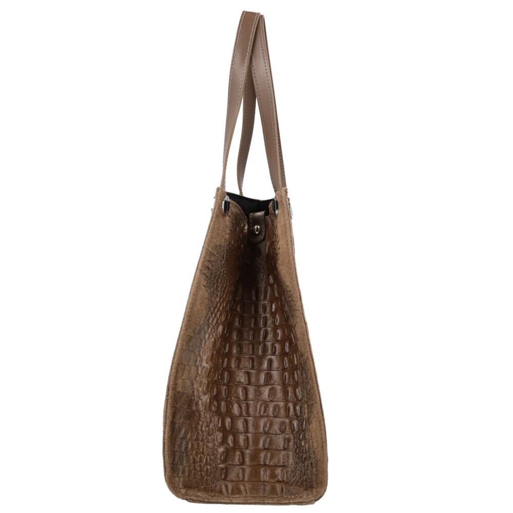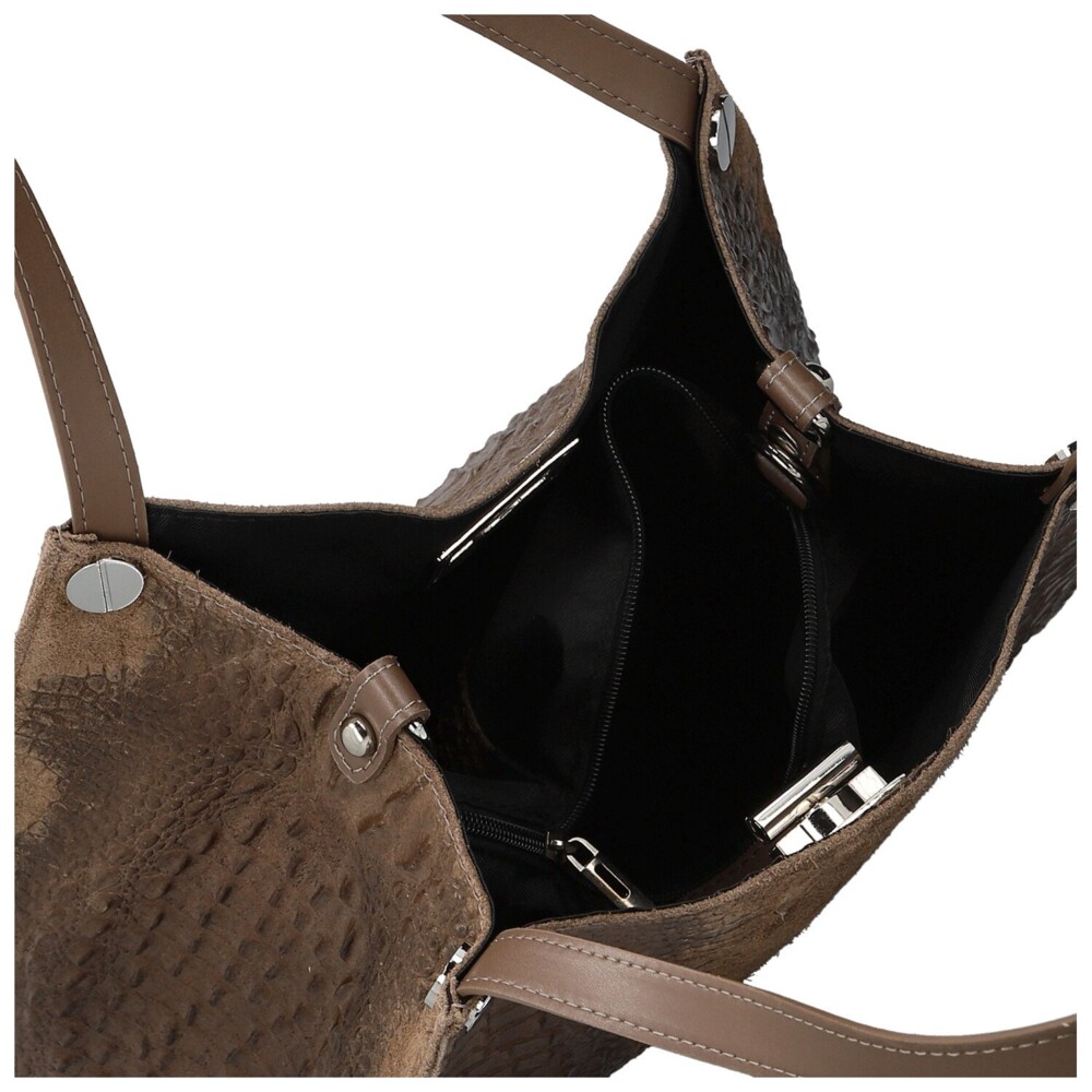 Styl a odvaha se setkávají v této kožené kabelce na rameno, která kombinuje měkkou broušenou kůži s lesklým hadím vzorem pro maximální efekt. Elegantní kožená ucha se stříbrnými detaily působí luxusně, zatímco hlavní kapsa se zapíná na stříbrný kovový zámeček, který chrání vaše věci. Uvnitř najdete praktickou zipovou kapsu, která poslouží jako organizér pro drobnosti. Dlouhý kožený popruh umožní pohodlné nošení přes rameno, ať už míříte do práce, na kávu s kamarádkou, nebo na večerní procházku městem. Kabelka, která zaujme na první pohled a nikdy nezklame. Objednejte ještě dnes a vyzkoušejte, vrátit ji můžete do 30ti dnů!