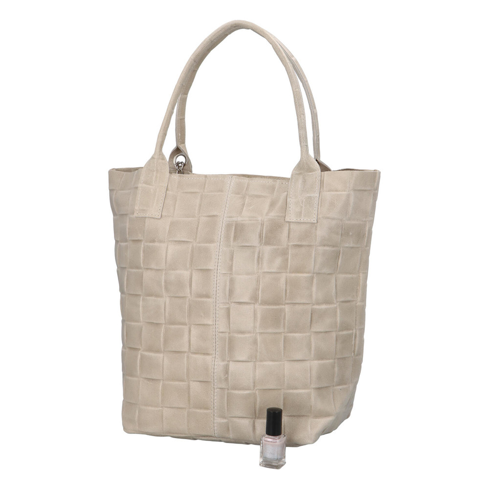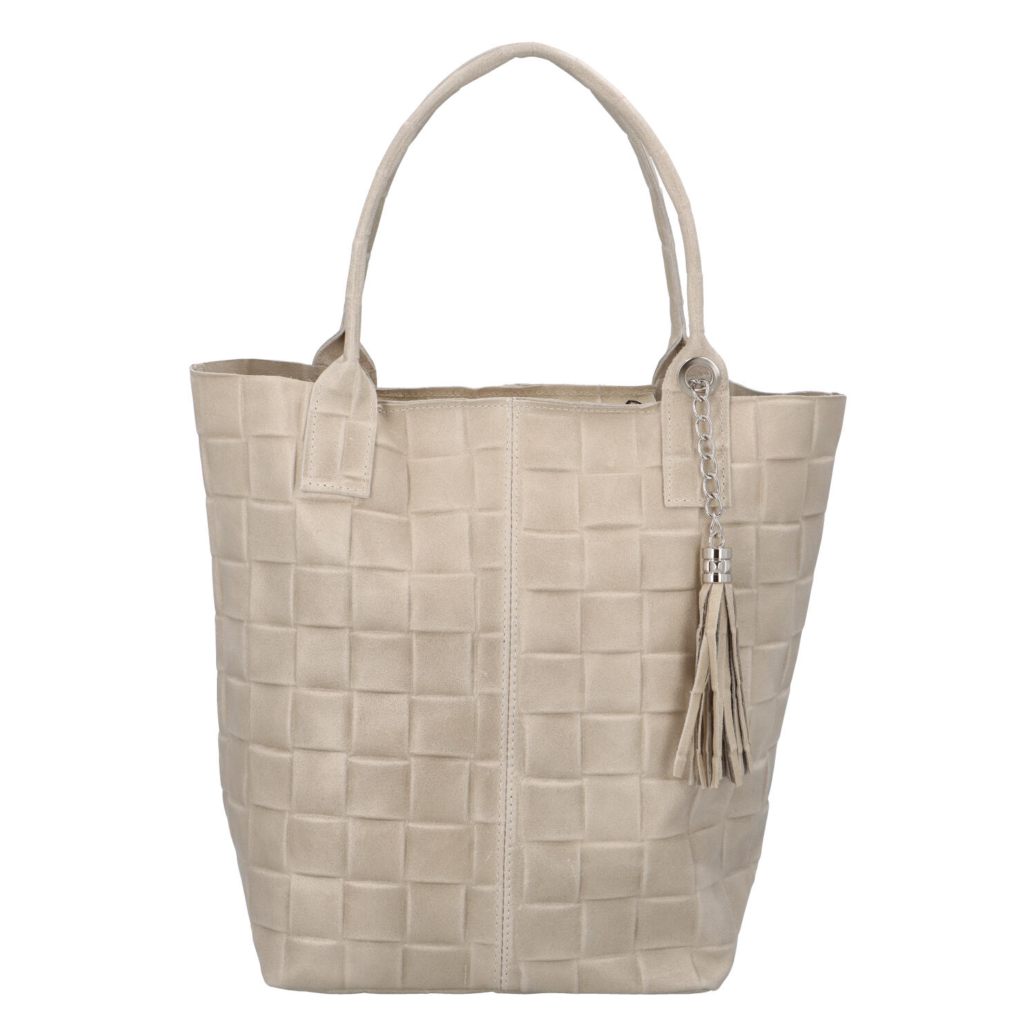 Béžová, kožená, originální kabelka přes rameno, od značky ItalY. Módně elegantní kousek k městskému dámskému outfitu, ale i do společnosti. Perfektní větší kabelka je z měkké vzorované kůže s pevnějším dnem. Hlavní část kabelky otevřete pomocí zipu. Vnitřní část kabelky je obyčejná, bez kapes. Disponuje jedinou koženou kapsičkou se zipem, upevněnou na řetízku, který prochází sponou ucha kabelky, kdy z druhé strany vypadá jako přívěsek ve formě střapců. ♕ Tuto "shopper" kabelku musíte mít! ♕
