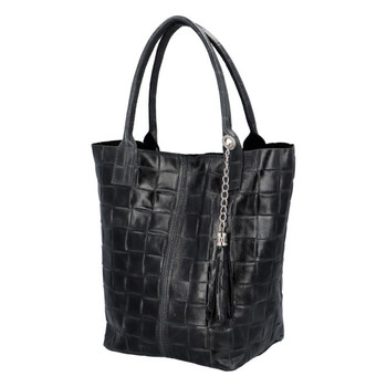 Černá, kožená, originální kabelka přes rameno, od značky ItalY. Módně elegantní kousek k městskému dámskému outfitu, ale i do společnosti. Perfektní větší kabelka je z měkké vzorované kůže s pevnějším dnem. Hlavní část kabelky otevřete pomocí zipu. Vnitřní část kabelky je obyčejná, bez kapes. Disponuje jedinou koženou kapsičkou se zipem, upevněnou na řetízku, který prochází sponou ucha kabelky, kdy z druhé strany vypadá jako přívěsek ve formě střapců. ♕ Tuto "shopper" kabelku musíte mít! ♕