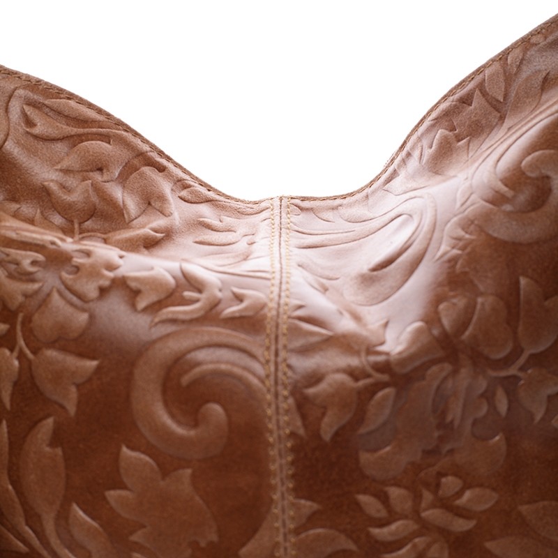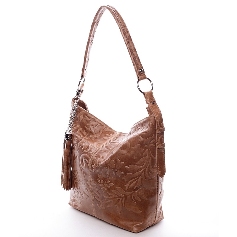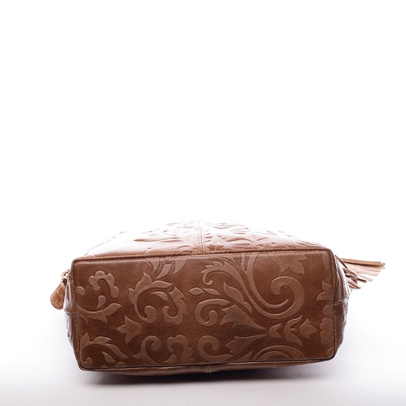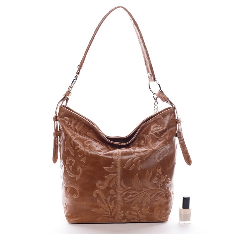 Hnědá luxusní střední měkká kožená kabelka ItalY. Elegantní kousek k ležérnímu dámskému outfitu s efektními vyraženými vzory po celém prostoru. Uvnitř je otevřený prostor a postranní kapsičky. Kabelku unosíte jak do práce tak i na vycházky. A hlavně, je kožená! Novinka. Objednejte ještě dnes a vyzkoušejte, vrátit ji můžete až za 30 dnů!