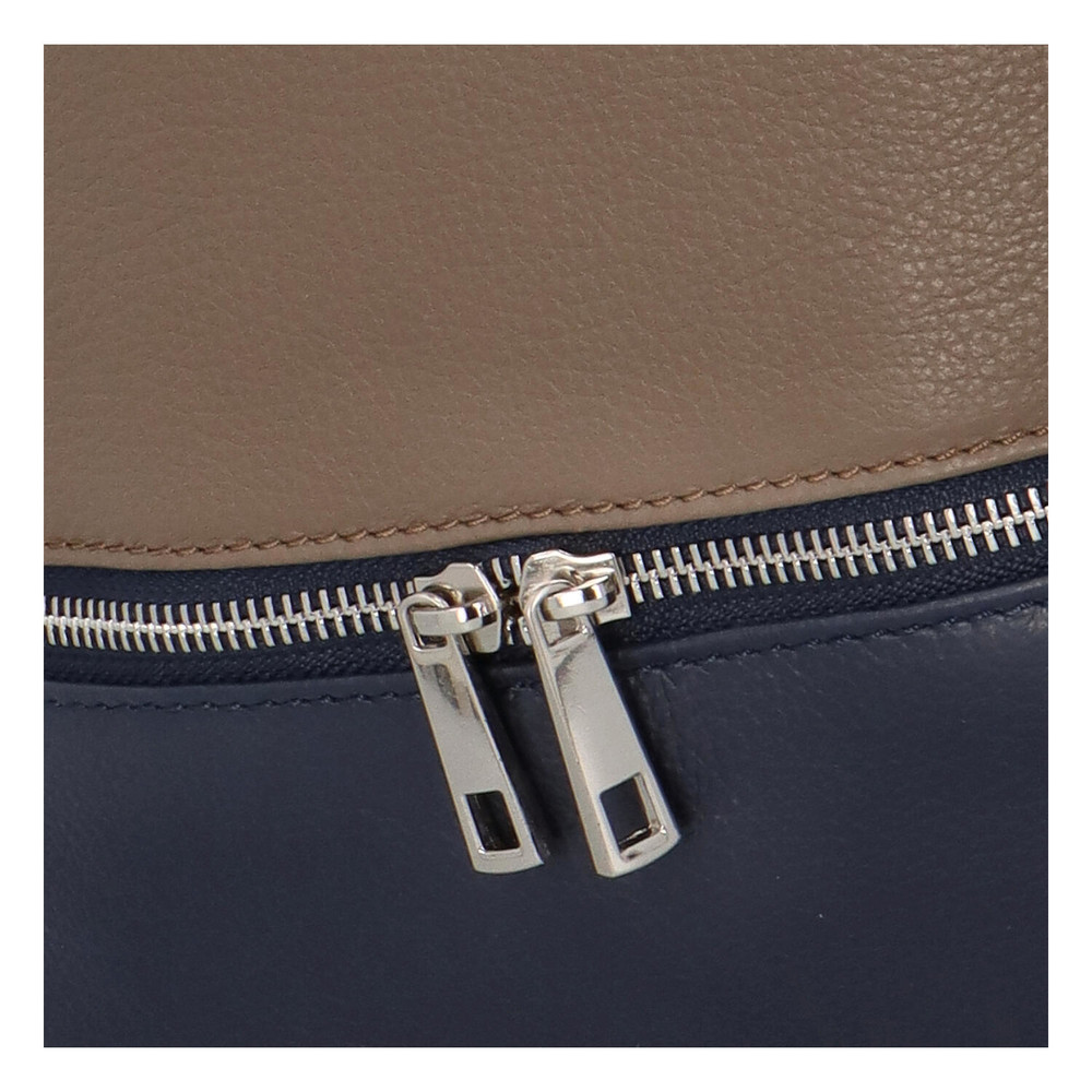 Khaki, luxusní, střední, měkká, kožená kabelka ItalY. Elegantní kousek k ležérnímu dámskému outfitu, ale i do práce, jako každodenní kabelka pomocník. Zepředu má praktickou podélnou kapsičku na zip třeba na deštník a tato část je v tmavě modré barvě. Novinka. Objednejte ještě dnes a vyzkoušejte, vrátit ji můžete až za 30 dnů!