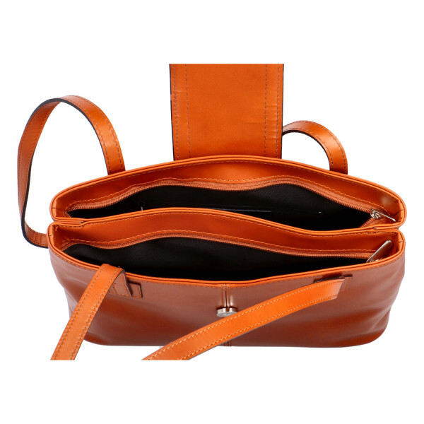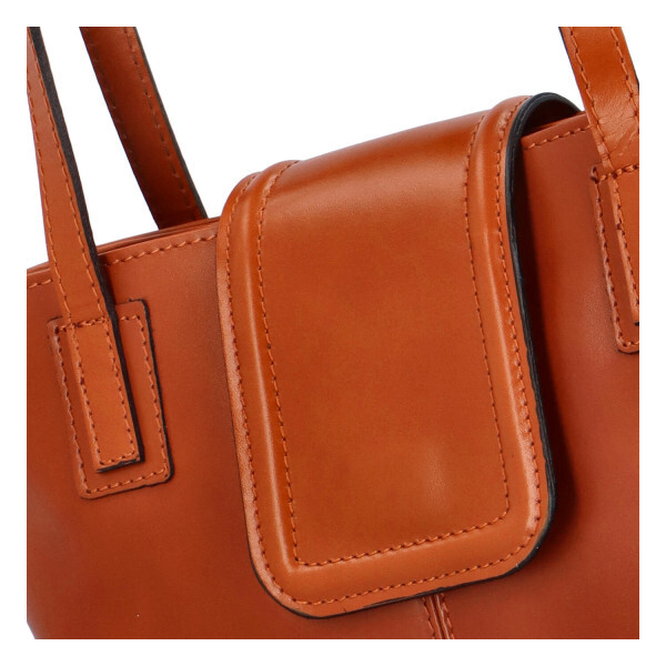 Středně velká, elegantní, kožená kabelka od značky ItalY v koňakové barvě je skvělým typem pro Váš outfit i šatník. Je skvělým doplňkem do divadla, do práce, do města i na vycházky. Její dno je pevnější, bude Vám jistě vyhovovat i po stránce prostoru. Má dvě hlavní kapsy, každá je zvlášť, vstup do nich je přes zipy. Přes kapsy přechází pás s magnetickým cvokem. Uvnitř najdete kapsičku se zipem na drobnosti. Objednejte ještě dnes a vyzkoušejte, vrátit ji můžete až za 30 dnů!