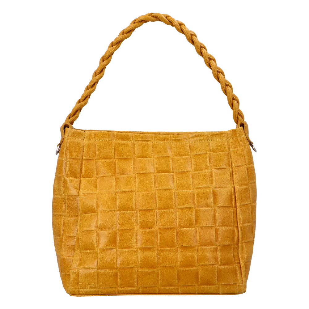 Tmavě žlutá, kožená, originální kabelka přes rameno, od značky Delami Vera Pelle. Módně elegantní kousek k městskému dámskému outfitu, ale i do společnosti. Perfektní větší kabelka je z měkké vzorované kůže s pevnějším dnem. Hlavní část kabelky otevřete pomocí zipu. Vnitřní část nabídne kapsičku na drobnosti. Kabelku lze nosit za ucho i s popruhem.