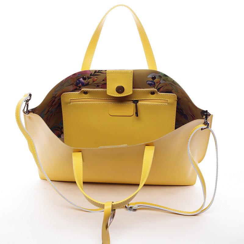 Žlutá luxusní kožená kabelka především do ruky nebo na předloktí ItalY s nadčasovým a zároveň trendy designem. Zavírání je vyřešeno Italským způsobem - magnetický cvoček, uvnitř je potom zipem uzavíratelný vak. Na stěně je jedna kapsa na zip. Ke kabelce lze připnout popruh. Novinka. Objednejte ještě dnes a vyzkoušejte, vrátit ji můžete až za 30 dnů!