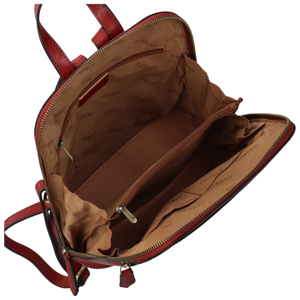 Dámský kožený batoh Katana je symbolem elegance v jednoduchém, nadčasovém provedení. Je vyroben z kvalitní, pevné kůže, která si uchovává svůj tvar i po letech nošení. Jemný lesk materiálu a precizní prošívání dodávají batohu luxusní vzhled s francouzským nádechem. Uvnitř hlavní kapsy na zip najdete přehledné uspořádání s kapsičkami v podšívce a středovou zipovou přihrádku, která prostor prakticky rozděluje. Na přední straně se nachází decentní logo značky Katana a elegantní vypouklá kapsa na zip, zatímco zadní zipová kapsa poskytne bezpečné místo pro cennosti. Pro pohodlné nošení má batoh pevné kožené ucho a nastavitelné popruhy, které se přizpůsobí vaší postavě. Mosazné kování podtrhuje jeho vytříbený charakter. Ideální volba pro ženy, které chtějí vypadat stylově, a přitom mít vše přehledně uspořádané. Objednejte ještě dnes a vyzkoušejte, vrátit jej můžete až do 30 dnů!