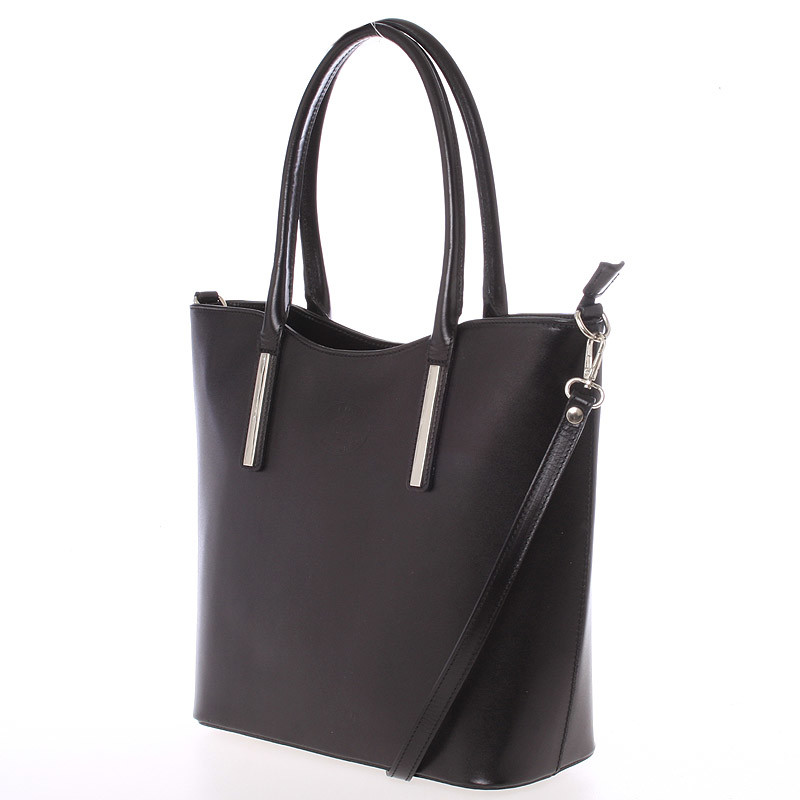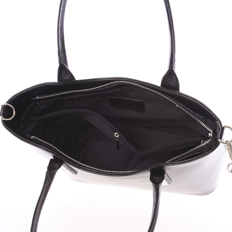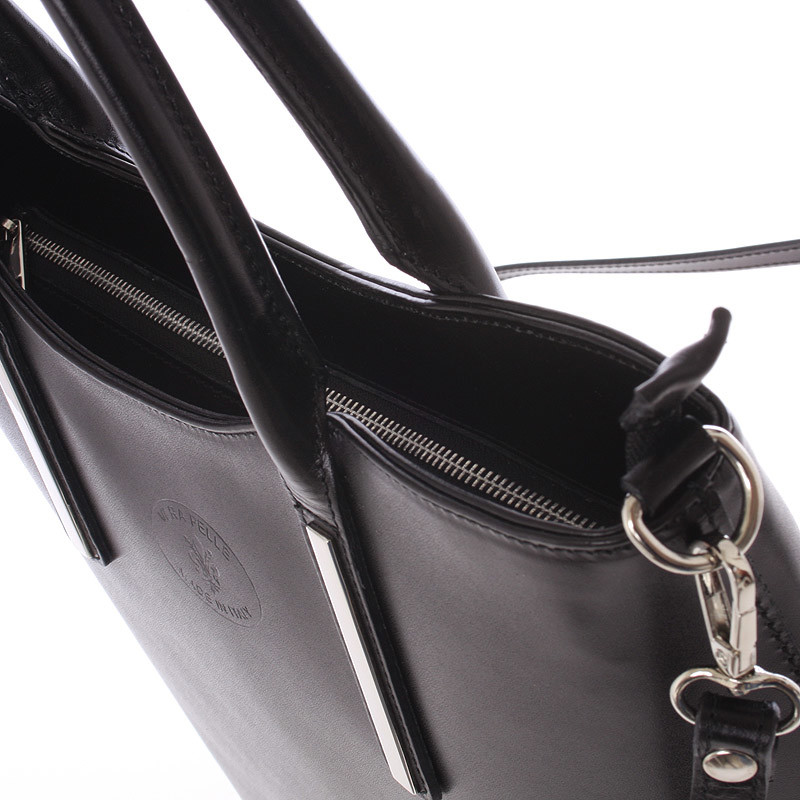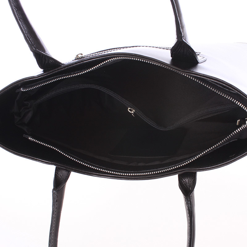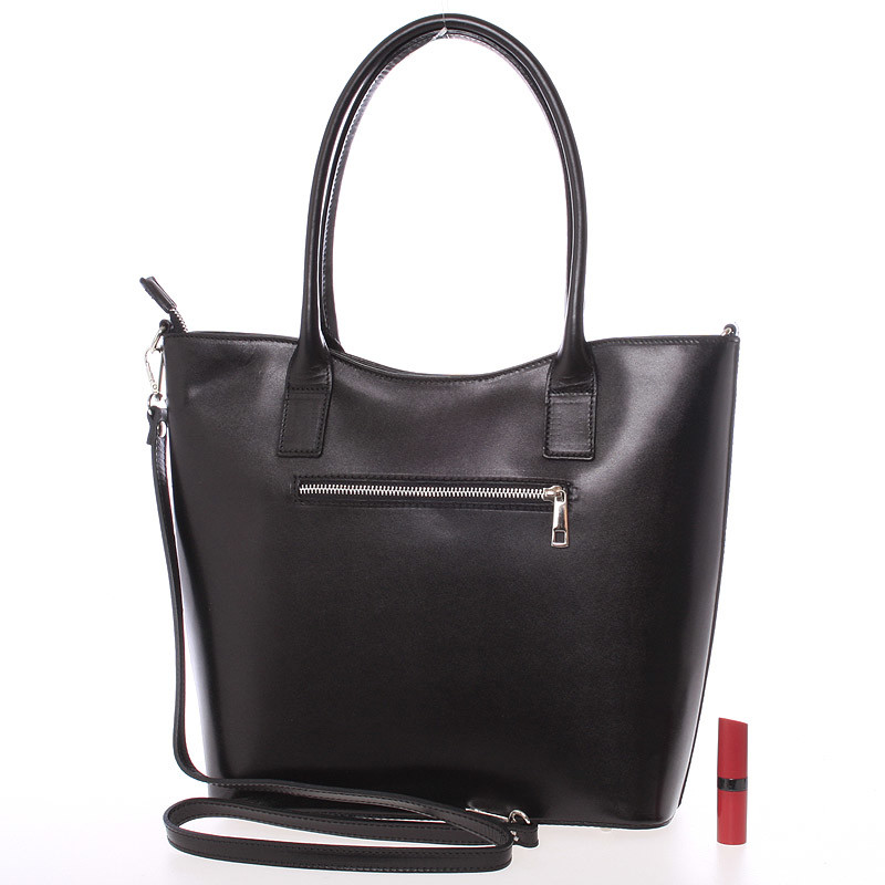 Jednoduchý design této černé kabelky potvrzuje eleganci výrobků značky ItalY. Tato velká pevná kožená kabelka Vás může doprovázet každý den. Hodí se jak do společnosti, tak i jako pravá ruka do práce a do města. Má ideální delší uši, ale i odnímatelný popruh. Zavírání je vyřešeno zipem. Uvnitř jsou dvě velké hlavní kapsy dělené přepážkou se zipem, použitelnou jako třetí kapsa. Na zadní stěně naleznete jak zevnitř, tak i zvenku kapsu se zipem. Nechybí zde menší volná kapsička na menší telefon. Objednejte ještě dnes a vyzkoušejte, vrátit ji můžete až za 30 dnů!