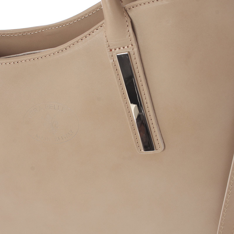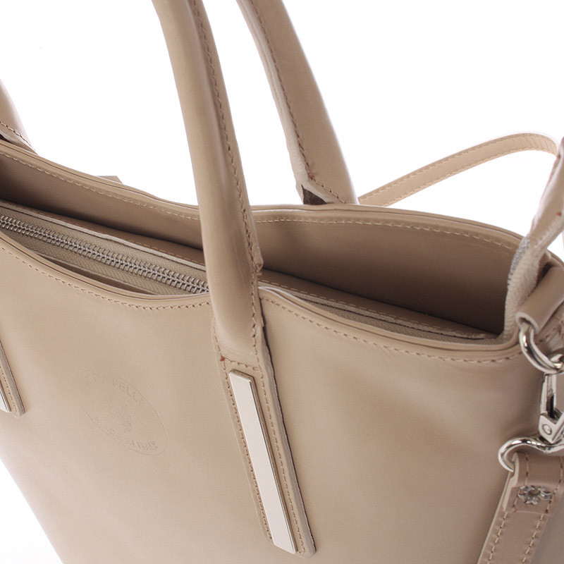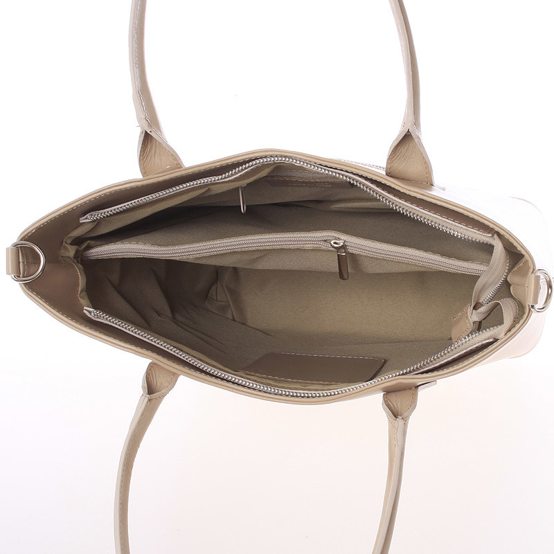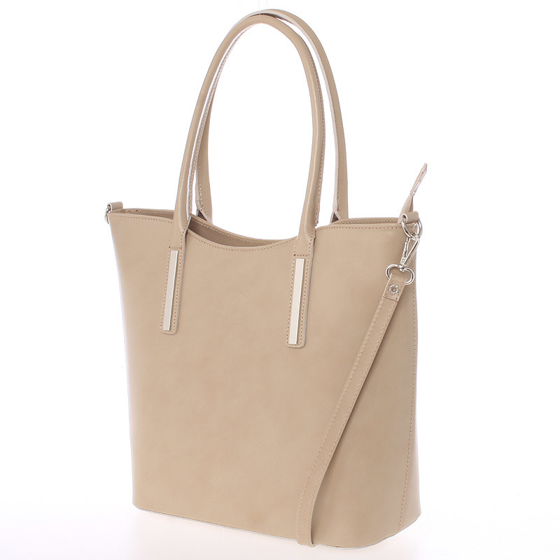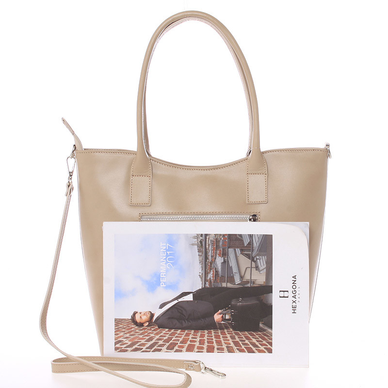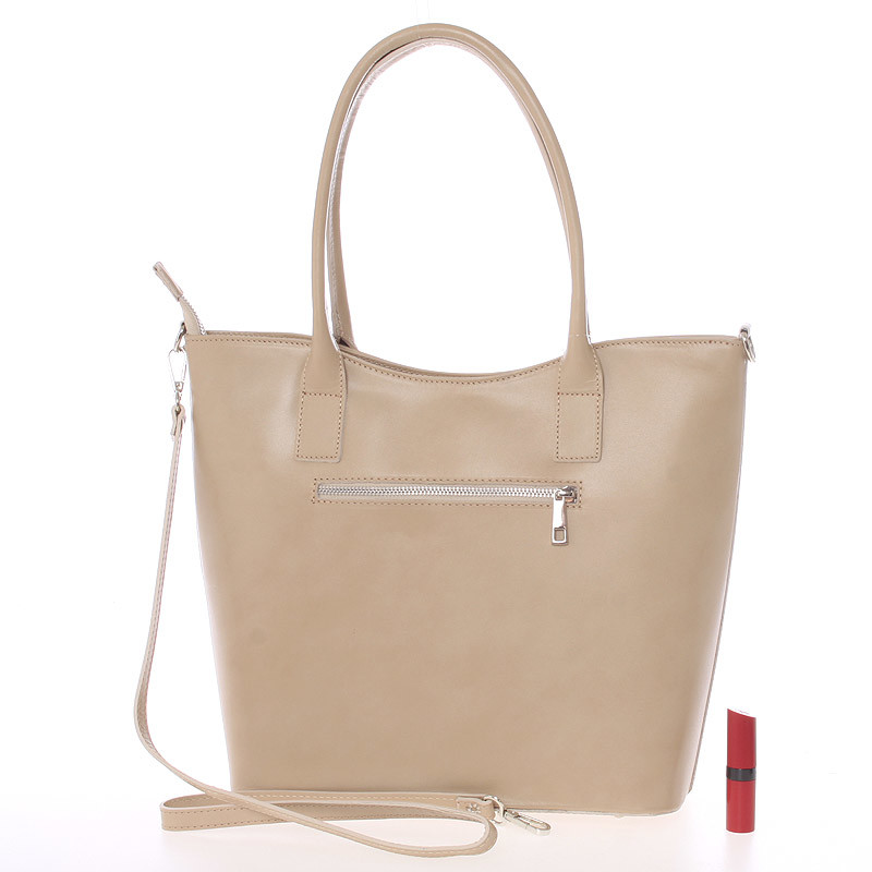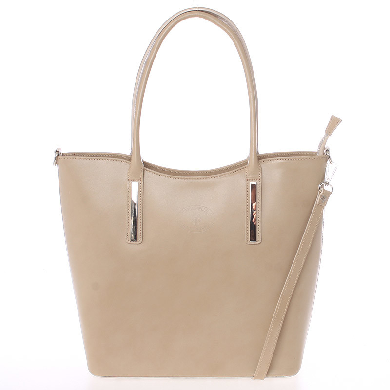 Jednoduchý design této tmavě béžové kabelky potvrzuje eleganci výrobků značky ItalY. Tato velká pevná kožená kabelka Vás může doprovázet každý den. Hodí se jak do společnosti, tak i jako pravá ruka do práce a do města. Má ideální delší uši, ale i odnímatelný popruh. Zavírání je vyřešeno zipem. Uvnitř jsou dvě velké hlavní kapsy dělené přepážkou se zipem, použitelnou jako třetí kapsa. Na zadní stěně naleznete jak zevnitř, tak i zvenku kapsu se zipem. Nechybí zde menší volná kapsička na menší telefon. Objednejte ještě dnes a vyzkoušejte, vrátit ji můžete až za 30 dnů!
