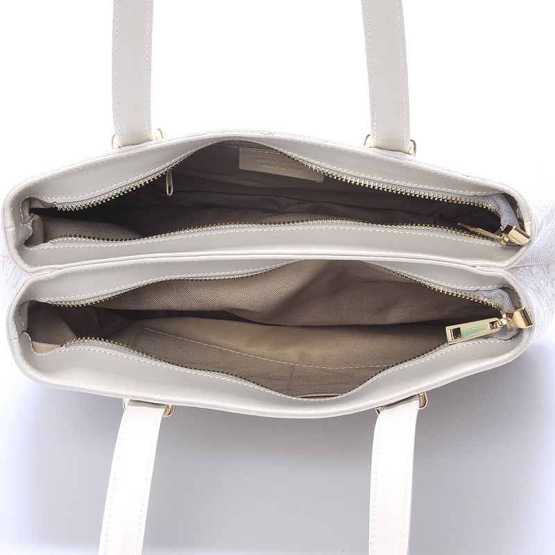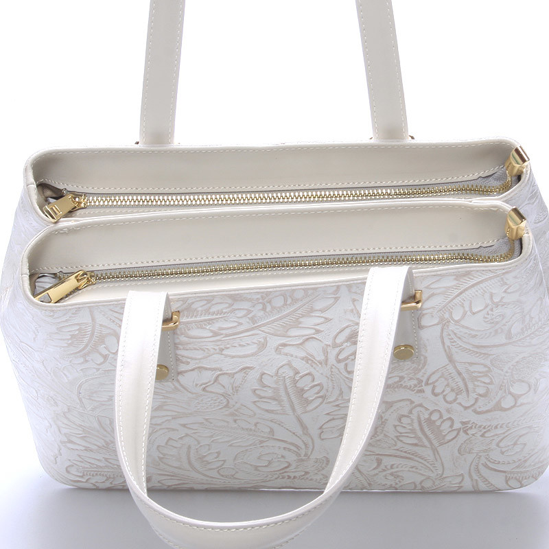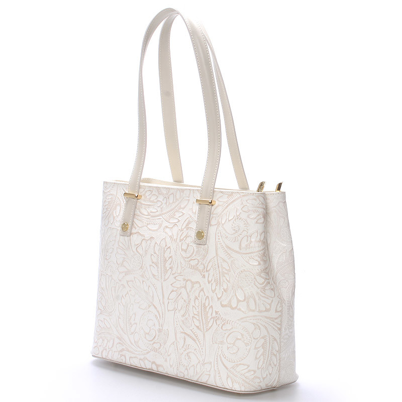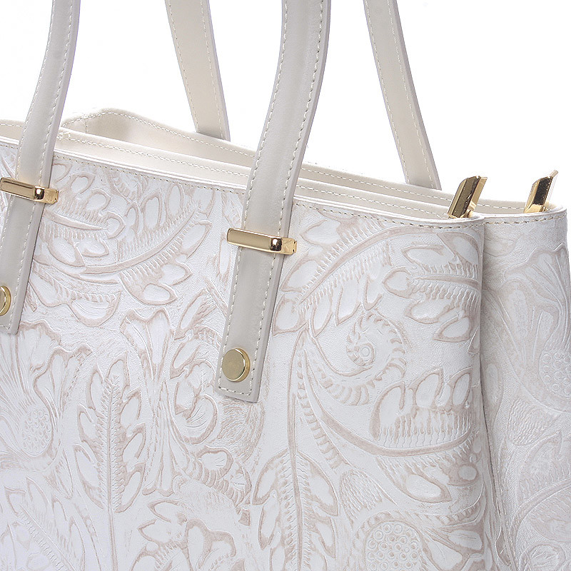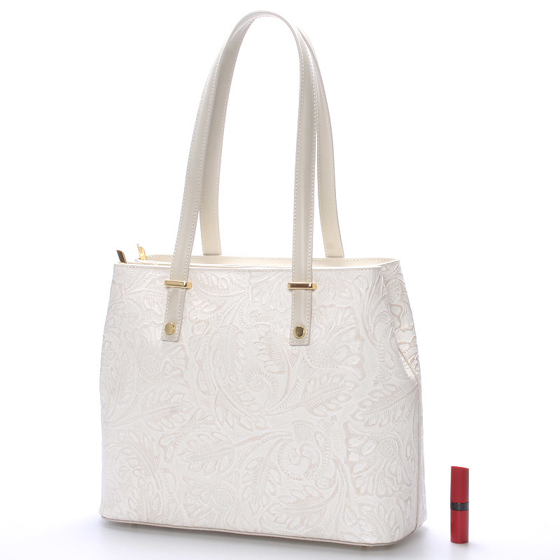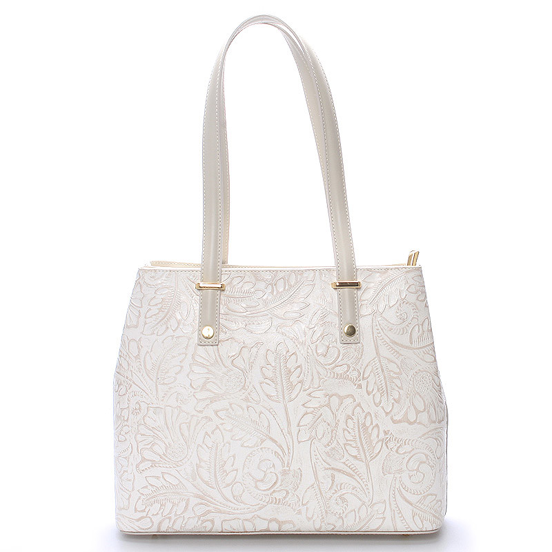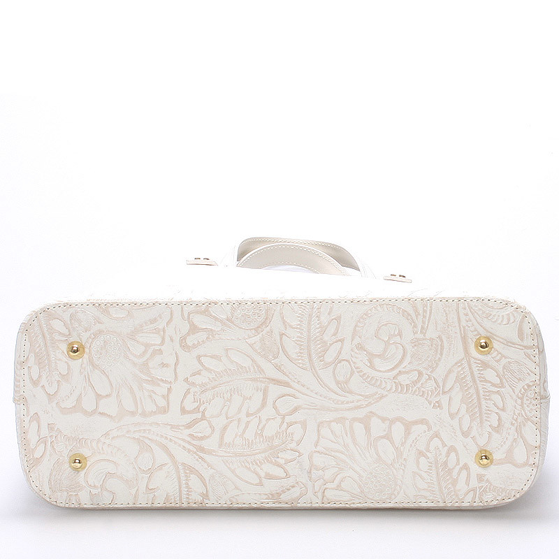 Exkluzivní krémová kožená kabelka do ruky ItalY. Pořiďte si hit této sezóny v kožených kabelkách. Exkluzivní středně velká kožená kabelka s vytlačovaným květinovým vzorem vás ohromí. S touto kabelkou rozhodně v davu nezapadnete a budete spolehlivě objektem obdivu. Kabelka je pevná, má dvě hlavní kapsy, které se zavírají zipem. V každé z nich má další kapsičky na drobnosti. Na spodní straně pevného dna má ochranné cvočky proti poškrábání. Kabelka má velké ucha, takže ji lze nosit i přes rameno. Novinka. Objednejte ještě dnes a vyzkoušejte, vrátit ji můžete až za 30 dnů!