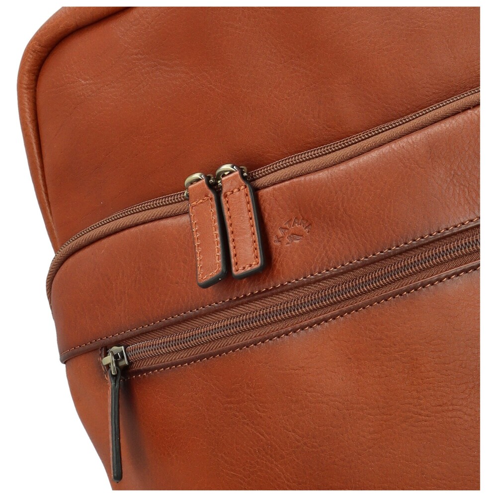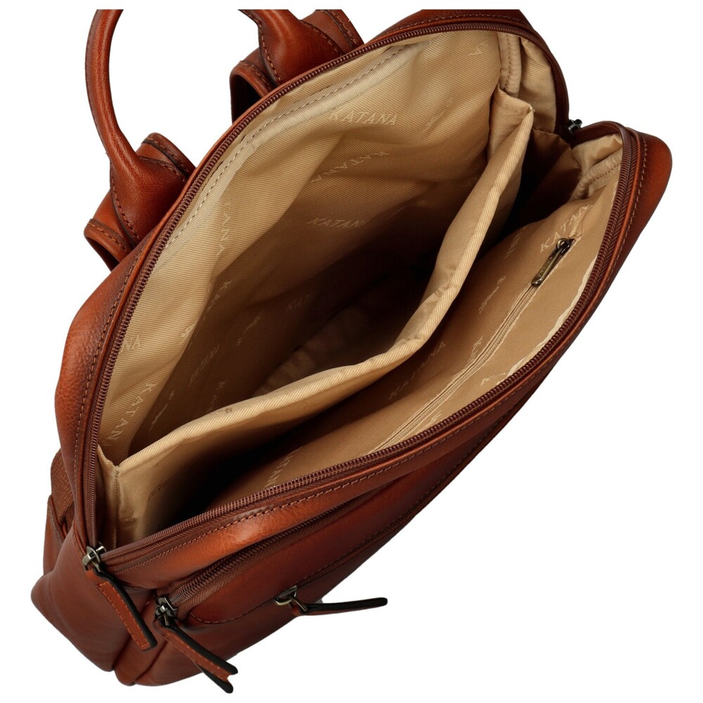 Tento kožený batoh Katana je důkazem, že praktičnost a styl mohou jít ruku v ruce. Vyrobený z kvalitní, jemné kůže, která působí sofistikovaně a přitom přirozeně ležérně. Uvnitř hlavní kapsy na zip se ukrývá přehledný prostor s kapsičkami v podšívce a oddělenou přihrádkou na notebook, takže vše má své místo. Přední část zdobí decentní logo značky Katana, prostorná vypouklá kapsa a navíc i menší zipová kapsička na drobnosti. Pro pohodlí při nošení je batoh vabaven měkce polstrovanými zády a nastavitelnými ramenními popruhy. Kožené ucho umožňuje snadné uchopení do ruky, když zrovna nechcete batoh nosit na zádech. Elegantní, funkční a nadčasový, to je batoh od značky Katana. Objednejte ještě dnes a vyzkoušejte, vrátit jej můžete až do 30 dnů!