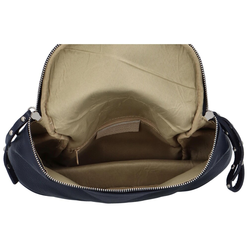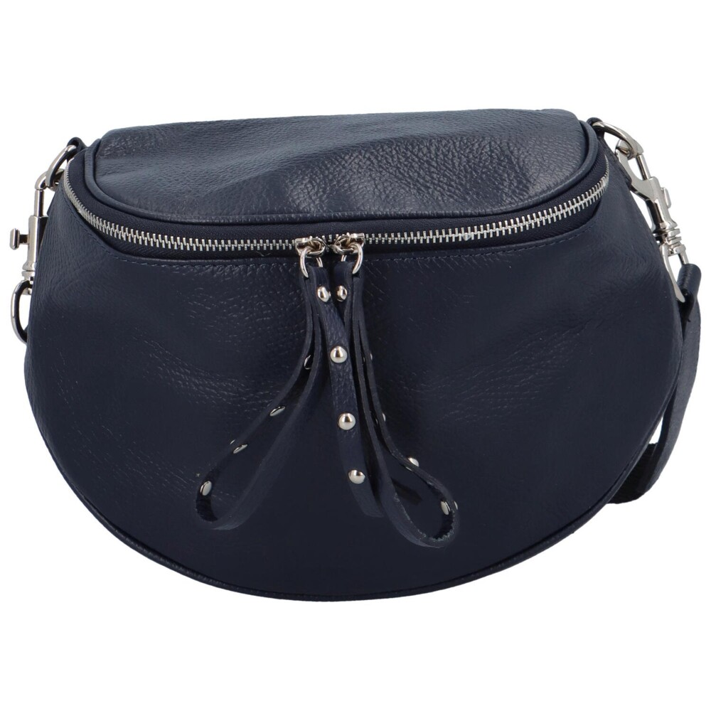Stylová kožená dámská ledvinka kabelka tmavě modrá značky ItalY. Originální tvar kabelky - něco mezi ledvinkou a dámskou crossbody kabelkou. Zavírá se dvojitým zipem, uvnitř je prostorná a vejdou se do ní všechny osobní věci. Objednejte ještě dnes a vyzkoušejte, vrátit ji můžete až za 30 dnů! Uvnitř je jedna kapsička na zip. Novinka.