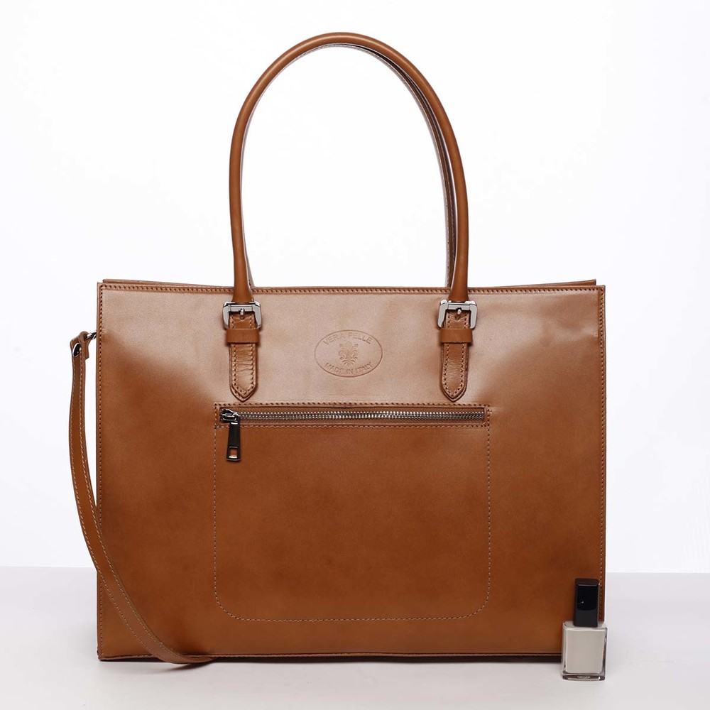 Doslova velkým hitem letošního jara, v koženém provedení, je tato elegantní a velice módní kabelka, značky ItalY v příjemné koňakové barvě. Kabelku můžete nosit do města, do práce, nebo do společnosti. Je ideálním odrazem luxusu a dobrého vkusu. Novinka. Objednejte ještě dnes a vyzkoušejte, vrátit ji můžete až za 30 dnů! Zavírá se zipem, je velká a prostorná, pevná, s pevným dnem na kterém jsou cvočky proti poškrábání. Uvnitř se dělí přepážkou se zipem na dvě velké části pro uložení všech Vašich potřeb a věcí. Zároveň jí nechybí tři menší kapsy na kosmetiku a drobnosti. Má odnímatelný popruh v barvě kabelky, takže ji lze nosit pohodlně přes rameno. Přední straně dodává styl a módnost menší kapsička se zipem.