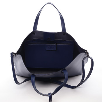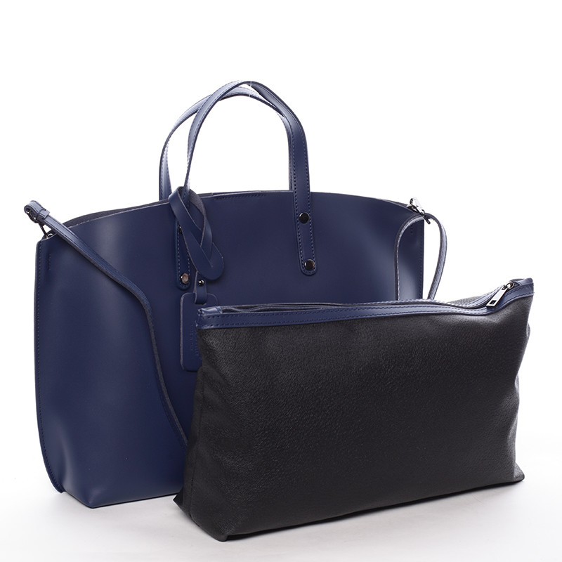 Modrá luxusní kožená kabelka především do ruky nebo na předloktí ItalY s nadčasovým a zároveň trendy designem. Zavírání je vyřešeno Italským způsobem - magnetický cvoček, uvnitř je potom zipem uzavíratelný vak. Na stěně je jedna kapsa na zip. Ke kabelce lze připnout popruh. Novinka 2016.