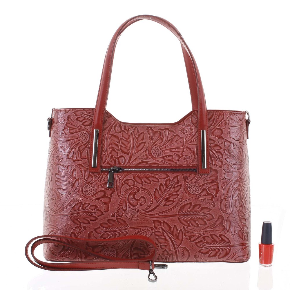 Novinka kolekce! Originální, velká, červená, kožená kabelka přes rameno, značky ItalY s vytlačovaným květinovým vzorem je skvostem mezi kabelkami této značky. Tato nádherná jedinečná kabelka Vás bude zdobit při každé společenské události. Hlavní kapsa je na zip, vnitřní části jsou děleny další kapsou se zipem, nechybí zde menší kapsičky na cennosti, drobnosti a kosmetiku. Kapsou disponuje i zadní strana kabelky. Spodní část tašky má spony proti oděrkám. Nosit ji lze na předloktí, přes rameno a to pouze za uši nebo i s popruhem. spolu s dalšími kapsičkami na drobnosti. Na spodní straně pevného dna má ochranné cvočky proti poškrábání. Kabelka má odnímatelný a nastavitelný popruh, takže ji lze nosit i přes rameno. Novinka. Objednejte ještě dnes a vyzkoušejte, vrátit ji můžete až za 30 dnů!