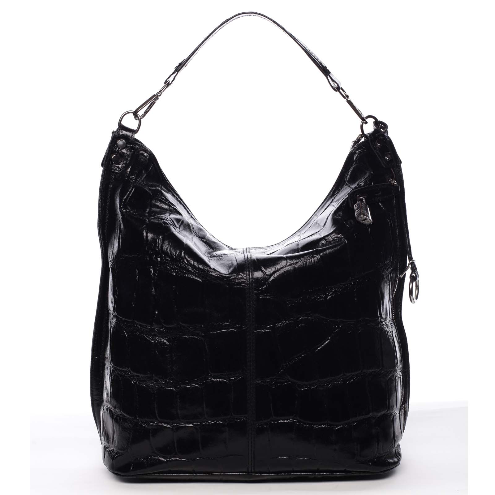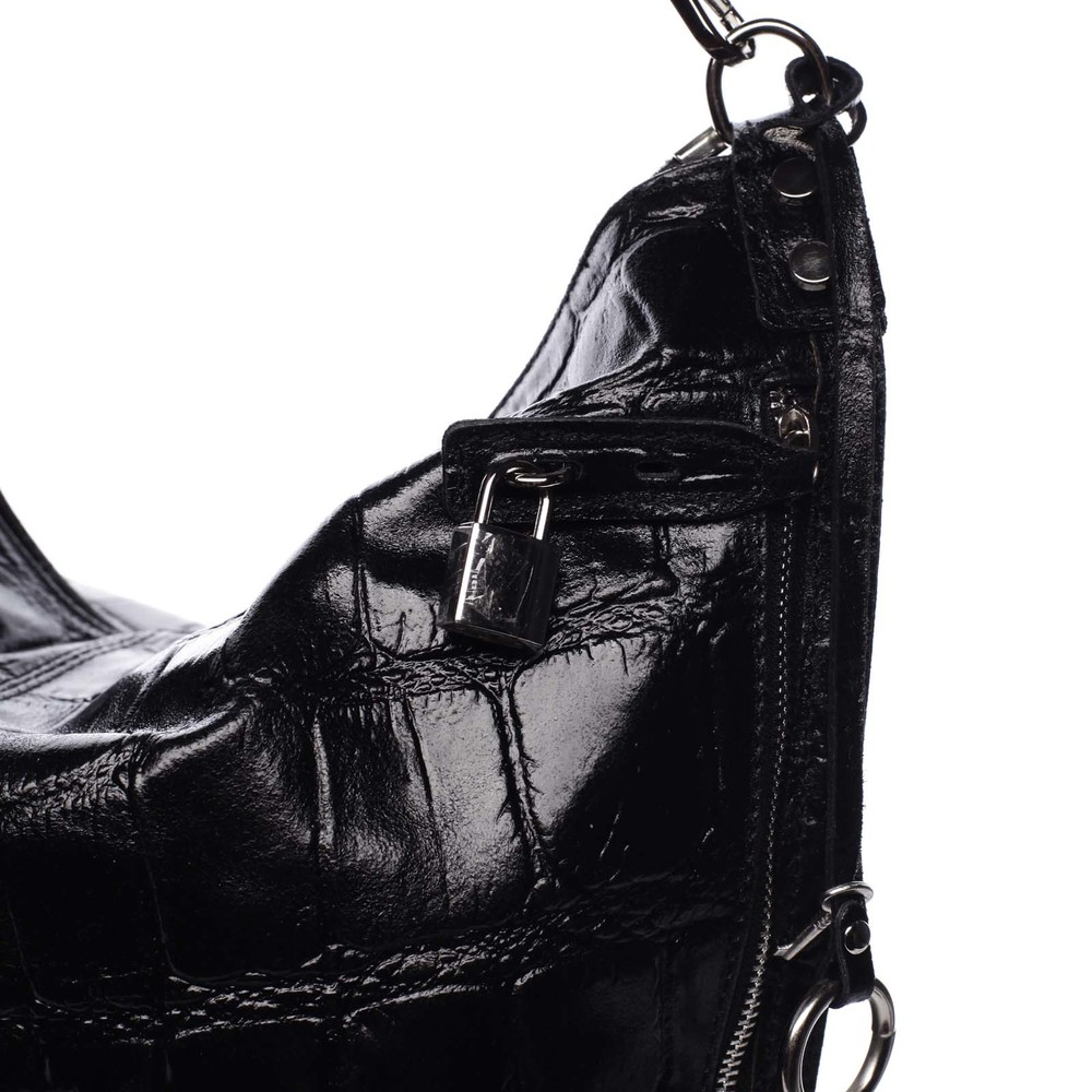Luxusní kousek. Z dílny značky ItalY Vám přinášíme model velké a kvalitní kabelky přes rameno v černé barvě. Kabelka je z pravé hovězí kůže a vyniká svým originálním zpracováním. Velký prostor otevírá zip, kde se uvnitř nachází několik menších kapsiček pro lepší přehlednost. Dvě jsou se zipem a dvě otevřené na mobilní telefon a drobnou kosmetiku. Odnímatelné je jak ucho, tak popruh, který má navíc nastavitelnou délku. Na přední straně luxusně působí také detail kapsy na zip, která je na malý zámek, ke kterému je na přívěsku přiložen klíček. Připnout si ho tak můžete ke klíčům a nejen, že budete ladit s kabelkou, i cennosti budete mít dobře ukryté. Kabelka je měkká, má pevnější dno a samozřejmostí je kapsa na zip na zadní straně. Objednejte ještě dnes a vyzkoušejte, vrátit ji můžete až za 30 dnů Pokud chcete mít v šatníku originální kousek. Model Celinda je tou správnou volbou!