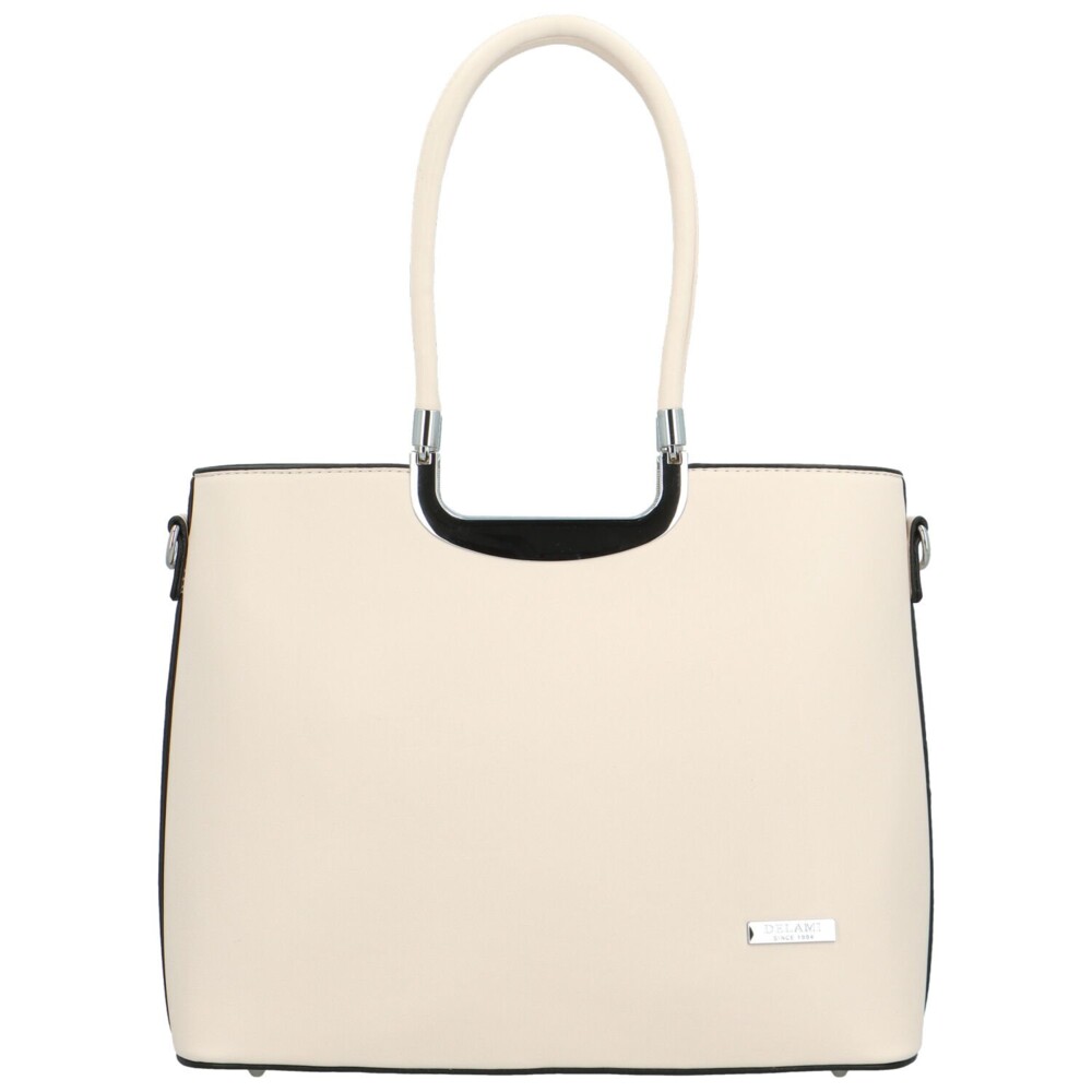 Luxusní, odlehčená kabelka Delami Bella Rosa se stane vaším stylovým doplňkem vždy a všude. Zaujme svou praktičností, hladkým povrchem, který je vyrobený s láskou z ekologické kůže, která je kvalitní a velmi příjemná. Čeští designéři dali důraz na kovový doplněk v tmavě stříbrné barvě, který spojuje pevné uši kabelky. Ty vám zaručeně perfektně padnou do ruky, ale i na zápěstí. Pro větší pohodlí a volné ruce, můžete připnout dlouhý popruh a nosit kabelku na rameni. Uvnitř kabelky najdete středovou zipovou kapsou i menšími postranními kapsičkami v podšívce, to vše zajistíte zipem. Zadní vnější strana také nabízí malou zipovou kapsičku. Přední stranu zdobí kovové logo značky Delami. Kabelku chrání kovové nožičky ve spodní části, proti poškrábání či zašpinění. Kabelka se hodí pro všední nošení i speciální příležitost a její design potěší každou milovnici módy. Objednejte ještě dnes a vyzkoušejte, vrátit ji můžete až do 30 dnů!