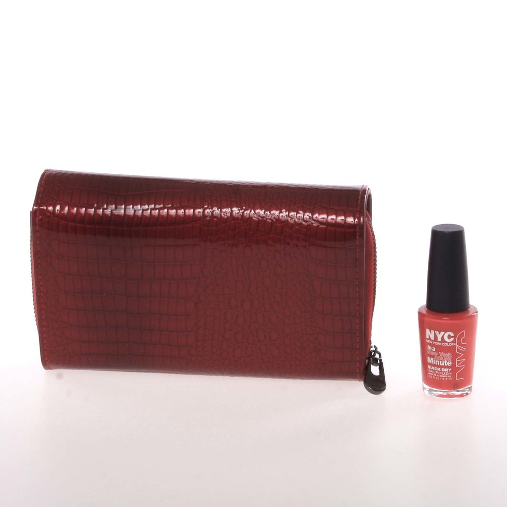 Střední elegantní dámská kožená červená lakovaná peněženka Vám v kabelce nesmí chybět! Peněženka má kroko vzorování. Vnitřní části peněženky jsou také vzorovány a důraz je kladen i na prošití peněženky, které mírně zaniká s barvou peněženky. Jistě při koupi tohoto produktu nebudete litovat! Nabídne Vám dostatek přihrádek pro bankovky, karty a samozřejmě mince. Nechybí ani logo značky na přední vnější straně. Novinka! Ideální jako dárek partnerce. Objednejte ještě dnes a vyzkoušejte, vrátit ji můžete až za 30 dnů!