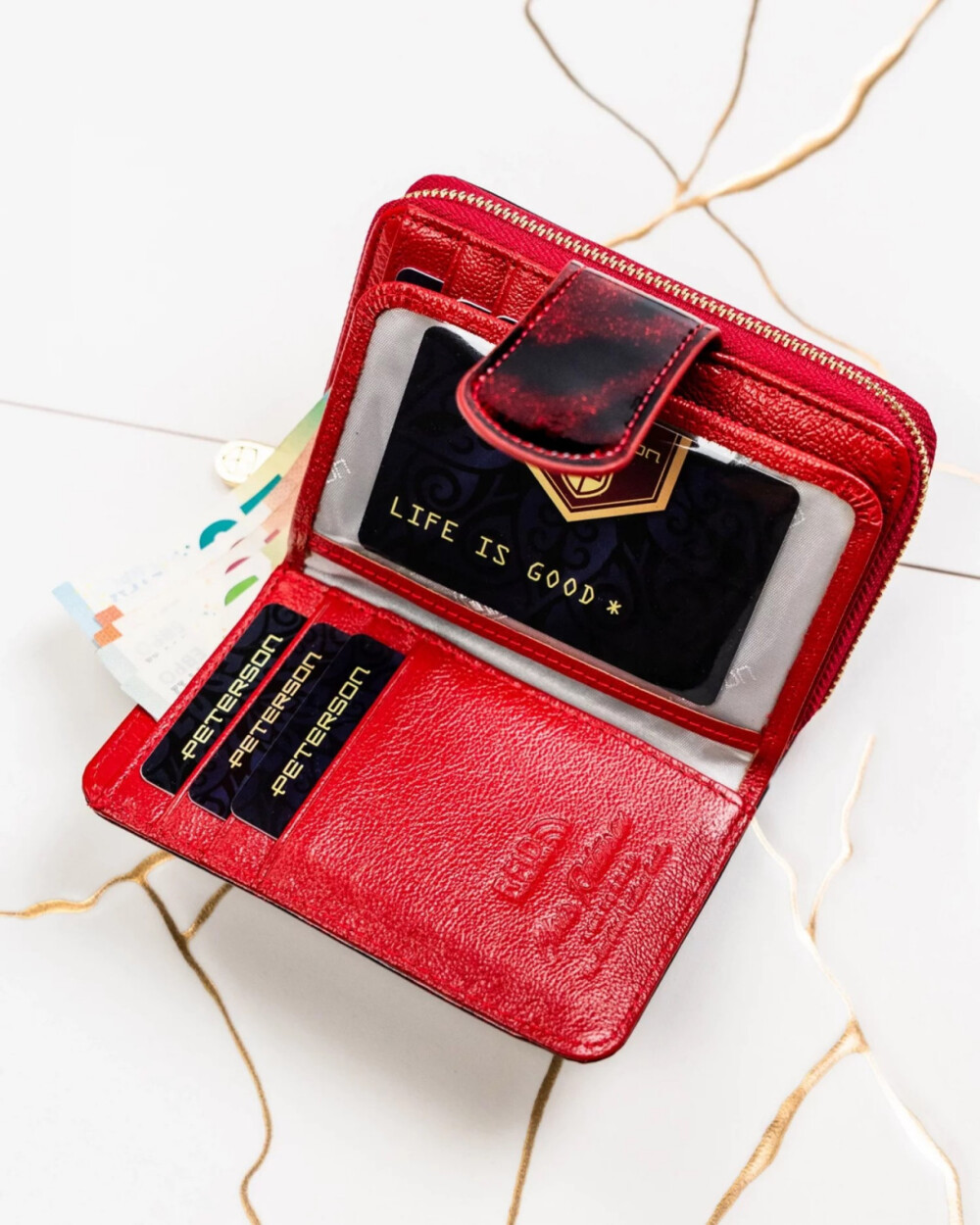 Lesk, elegance a praktická organizace v jednom, taková je tato dámská koženko-kožená peněženka. Na zapínací klopě se blyští kulaté logo značky Peterson, které dodává luxusní nádech. Po otevření se skrývá prostor pro karty a papírové peníze s RFID ochranou, takže vaše data jsou vždy v bezpečí. Zadní zipová kapsa na mince je připravena na drobné, které potřebujete mít po ruce. Peněženka v kombinaci černé a červené metalízy je perfektním doplňkem pro ty, kdo chtějí nosit styl i praktičnost v jednom. Objednejte ještě dnes a vyzkoušejte, vrátit ji můžete do 30ti dnů.