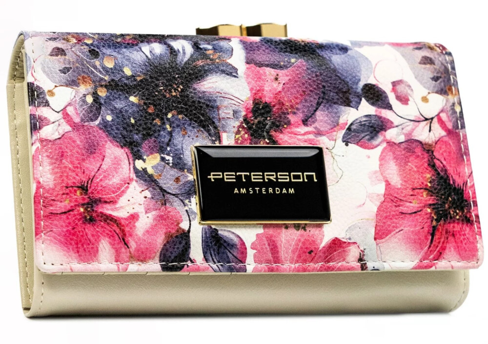 Elegantní dámská peněženka Peterson s květinovým motivem, který zdobí celou přední stranu. Dominantou je kovové logo značky umístěné uprostřed. Peněženka se uzavírá na druk a uvnitř ukrývá přihrádky na karty i bankovky. Zadní část je řešená klasickým mincovníkem v kovovém rámečku se zlatým kováním. Peněženka je vybavena technologií RFID, která chrání vaše karty před nežádoucím skenováním. Dodává se v dárkové krabičce, ideální i jako stylový dárek. Objednejte ještě dnes a vyzkoušejte, vrátit ji můžete do 30ti dnů.
