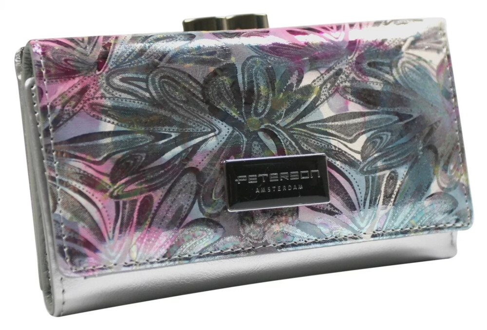 Módní dámská peněženka Peterson v oblíbeném květinovém motivu. Přední strana je ozdobena barevným potiskem s květy a doplněna kovovým logem značky. Uzavírá se na druk, uvnitř se nachází přehledné přihrádky na platební karty a kapsy na bankovky. Na druhé straně je praktický mincovník v kovovém rámečku se stříbrným kováním. Peněženka je vybavena RFID ochranou, která chrání vaše karty před neoprávněným skenováním. Dodává se v elegantní dárkové krabičce. Objednejte ještě dnes a vyzkoušejte, vrátit ji můžete do 30ti dnů.