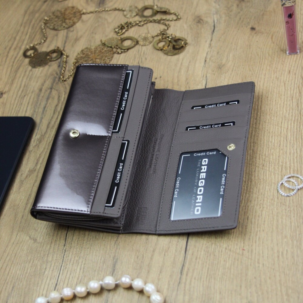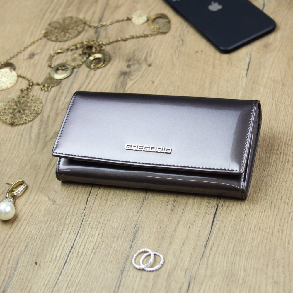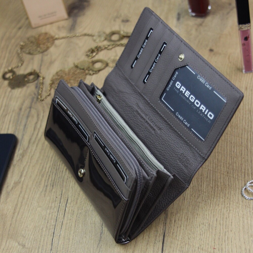 Luxusní peněženka od značky Gregorio, která se otevírá v hlavní části na druk a nabízí pak prostor pro vaše doklady, platební karty i papírové peníze, je tam i kapsička na zip pro vaše mince. Peněženka je z kvalitní lakované kůže. Na přední straně logo značky. Dodává se v dárkové krabičce. Tak objednejte ještě dnes a vyzkoušejte, vrátit ji můžete do 30ti dnů.