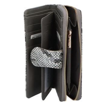 V luxusním provedení šitá, dámská kožená peněženka, která se stane vaším dokonalým doplňkem. Hadí design upoutá každého. Po rozevření zápinky na druk, nabízí dostatek místa pro uložení vašich papírových peněz, dokladů i karet. Na boční straně je velká kapsa na zip, pro uložení mincí. Přední díl peněženky zdobí stylové logo značky. Doplňky jsou v módní zlaté barvě. Zboží se dodává v dárkové krabičce. Tak objednejte ještě dnes a vyzkoušejte, vrátit ji můžete až za 30 dnů!