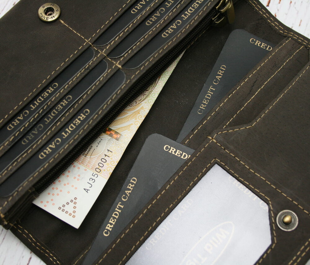 Nadčasová kožená peněženka od značky Wild s krásným kontrastním prošitím. Po rozevření klopy na druk peněženka nabízí dostatek místa pro praktické rozložení vašich papírových i kovových peněz, dokladů či karet. Uvnitř si můžete uschovat i fotografii vašich blízkých, díky průhlednému okénku. Jsou tam dvě zipové kapsy pro mince či drobnosti. Přihrádky na papírové peníze i na platební karty. Zadní část má velkou přihrádku na zip. Peněženku zdobí kontrastní prošívání i vyražené logo na klopě. Objednejte ještě dnes a vyzkoušejte, vrátit ji můžete až za 30 dnů!