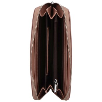 Dámské pouzdro/peněženka od značky Coveri. Jednoduchá, líbivá, bledě růžová peněženka, která se otevírá zipem. Vnitřní úložiště je rozdělené na tři hlavní přihrádky na bankovky, kapsičku na mince a několik přihrádek na kreditní karty a doklady.