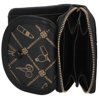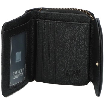 Malá luxusní peněženka pro ženy, od značky Coveri. Černá peněženka se skládá ze dvou částí. Jedna část nabídne přihrádky na kovové mince, uzavírá se zipem. Druhá část se otevírá klopou s kovovým cvokem-knoflíčkem. Je zde přihrádka na bankovky a pár přihrádek na kreditní karty a doklady. Tak objednejte ještě dnes a vyzkoušejte, vrátit ji můžete do 30ti dnů.