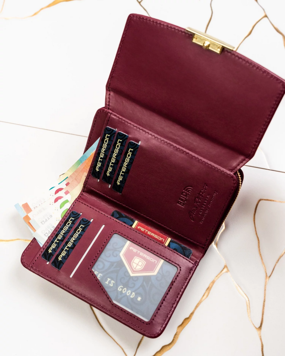 Syntetická peněženka Peterson zaujme čistým designem a praktickým uspořádáním. Na přední straně se nachází klopa doplněná elegantním logem značky, které dodává peněžence moderní a výrazný vzhled. Po otevření klopy najdete prostor pro vaše karty a papírové bankovky, vše přehledně a jednoduše uspořádané. Zadní část peněženky má samostatnou zipovou kapsu na mince, která je ideální pro bezpečné uložení drobných. Zlaté kování podtrhuje celkový elegantní styl a integrovaná RFID ochrana zajistí bezpečí vašich platebních údajů. Peněženka je navíc dodávána v dárkové krabičce. Objednejte ještě dnes a vyzkoušejte, vrátit ji můžete do 30ti dnů.