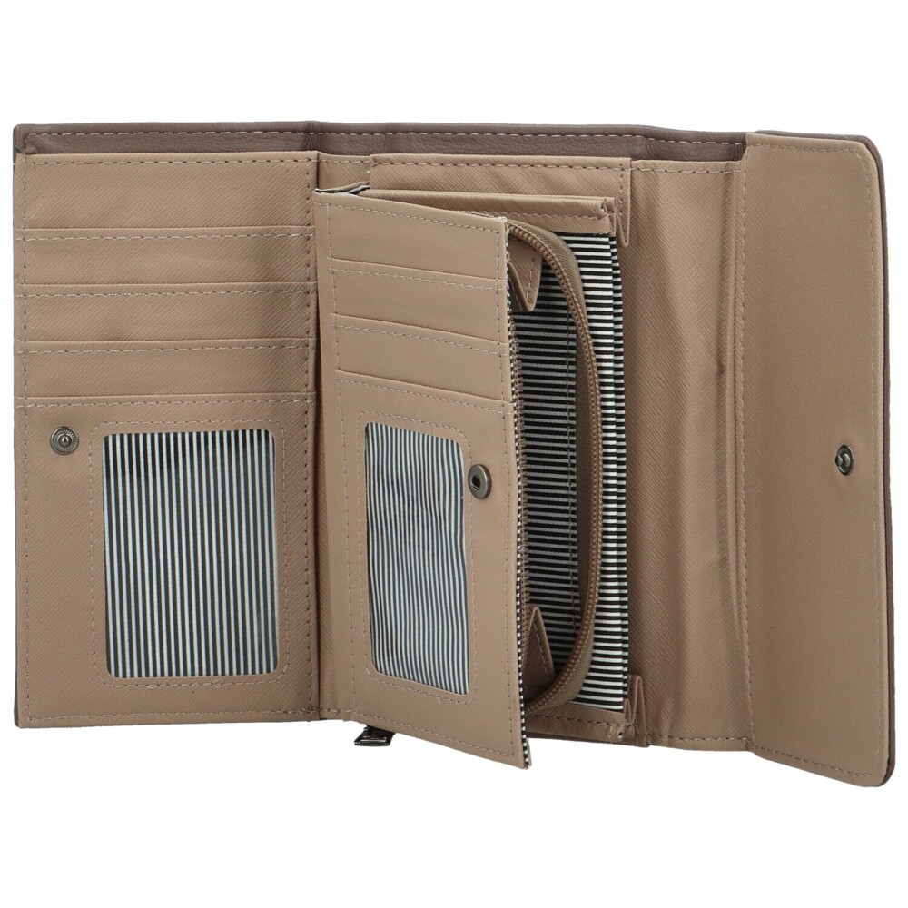 Sympatická dámská peněženka s mnoha přihrádkami a kapsami. Po otevření druku najdete dostatek místa pro všechny vaše platební karty, doklady i papírové peníze. Pro mince je kapsička se zipem. Stříbrné kování a logo značky na přední straně doladí jemný design. Stylový kousek, který se svou velikostí vejde i do menších kabelek. Objednejte ještě dnes a vyzkoušejte, vrátit ji můžete až do 30 dnů!