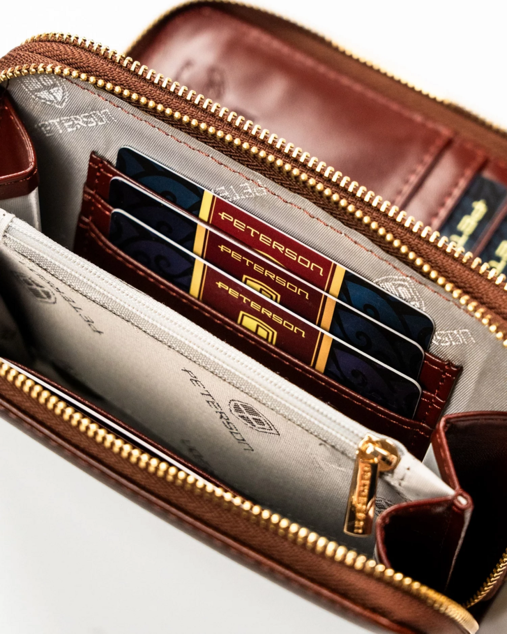Stylová koženková peněženka Peterson střední velikosti je navržena tak, aby nabídla maximum místa v elegantním provedení. Přední stranu zdobí výrazné logo Peterson, které okamžitě upoutá pozornost. Peněženka je rozdělena do dvou samostatných zipových částí. Jedna kapsa je ideální na mince, abyste je měli vždy po ruce, a druhá poskytuje přehledný prostor pro platební karty i papírové bankovky. Ochranu vašim kartám zajišťuje RFID technologie, která brání jejich neoprávněnému načtení. Luxusní dojem podtrhuje zlaté kování, které krásně ladí s celkovým designem. Peněženka je navíc uložena v elegantní dárkové krabičce. Objednejte ještě dnes a vyzkoušejte, vrátit ji můžete do 30ti dnů.