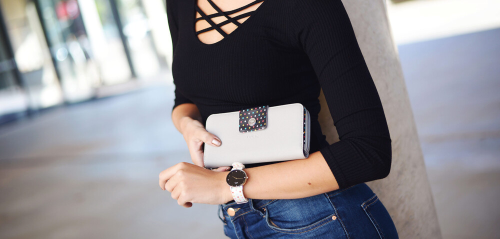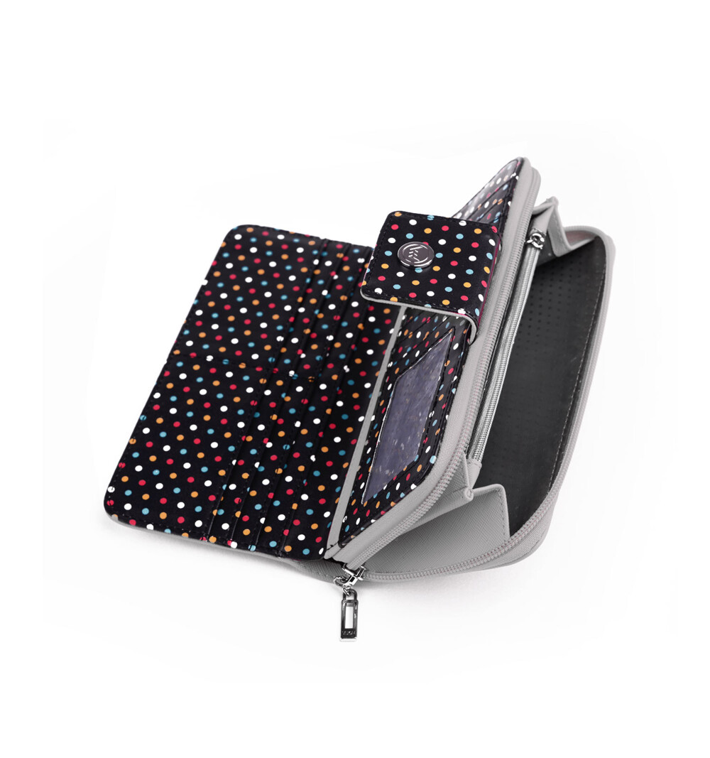 Větší dámská peněženka ve světle šedém designu s puntíky. Vuch peněženky jsou prostě TOP! Objednejte ještě dnes a vyzkoušejte, vrátit ji můžete až za 30 dnů! Peněženka má dvě části. Jedna část je s kovovým cvokem, zde uložíte bankovky, doklady a až 12 kreditních karet. Druhá část se otevírá zipem, tady je místo na drobné a kovové mince, navíc je zde kapsička se zipem na drobnosti.