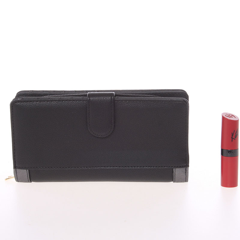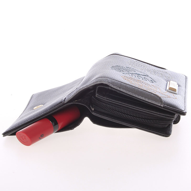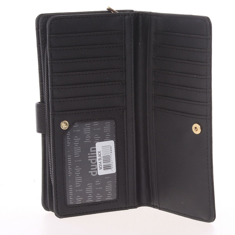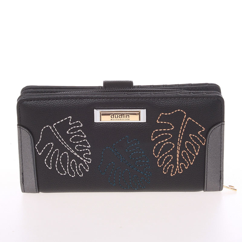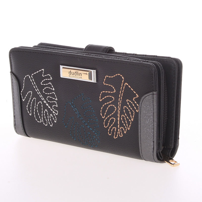 Velká originální a kvalitní dámská peněženka značky Dudlin, se Vám představuje v zajímavé kombinaci černé a stříbrné barvy, kdy jsou na přední straně peněženky vyšity vzory lístků (bílá, tyrkysová, lososová). Nabízí obrovský prostor, kde ukryjete všechny druhy karet, vizitek a financí. Rozkládá se na obě strany, které se otevírají klasickými cvočky. Prostřední část je na zip.