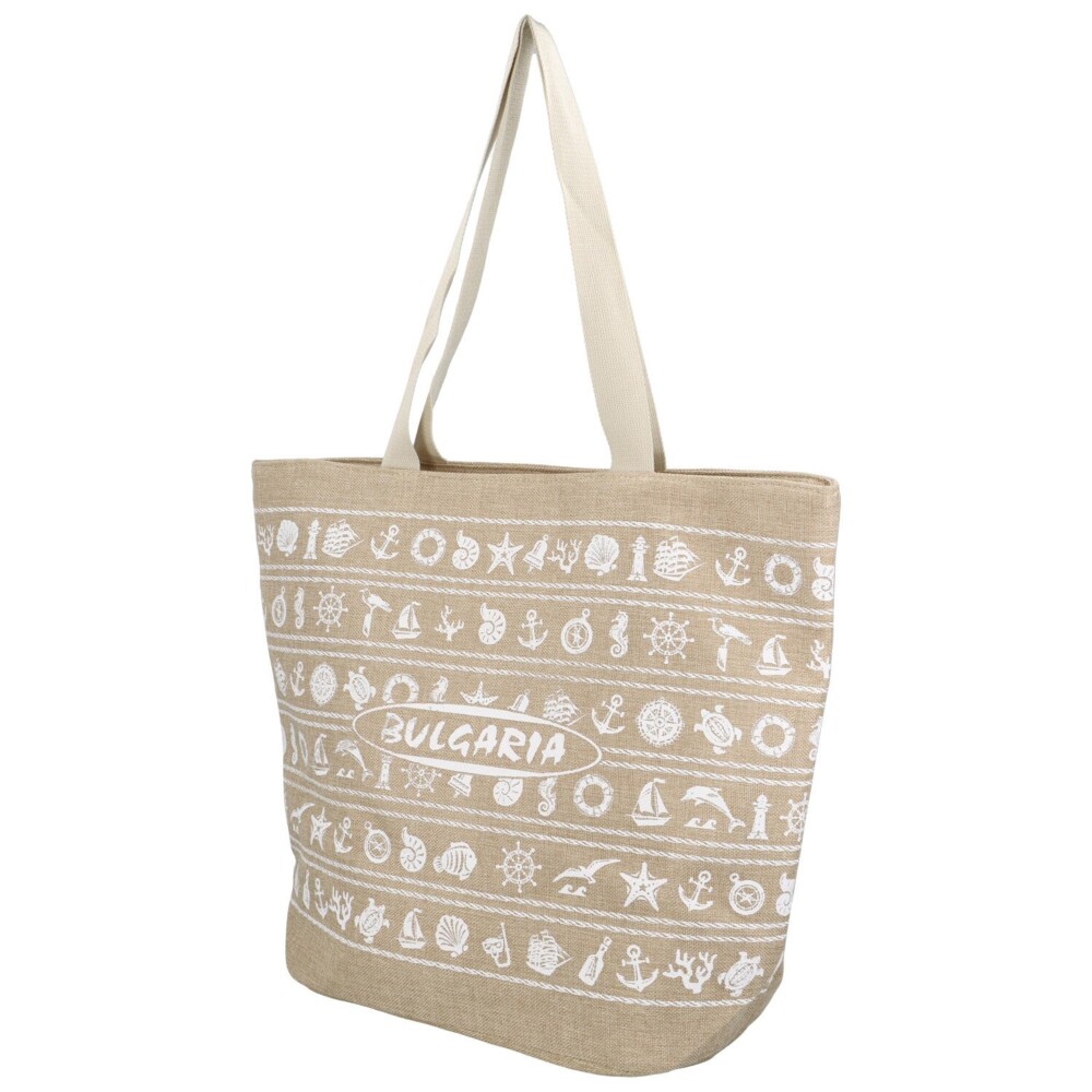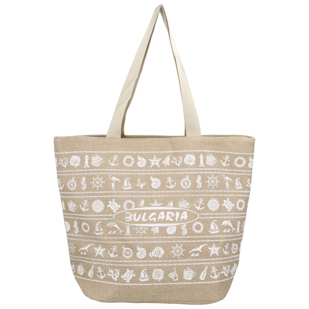 Dámská látková taška na pláž - plážová kabelka přes rameno, s dlouhým uchem a bílým designem darů moře na béžovém podkladu. Delami. Otevírá se pomocí zipu a uvnitř najdete volnou kapsičku na drobnosti nebo telefon či opalovací krém. Taška nabízí prostor a moderní vzhled.