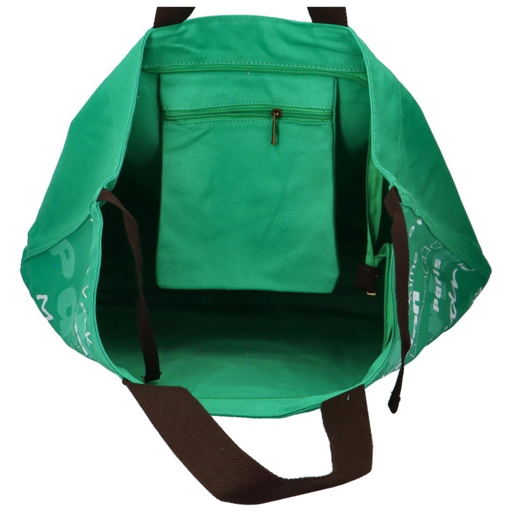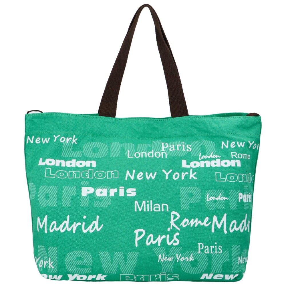 Dámská látková taška na pláž - plážová kabelka přes rameno, s dlouhým uchem a moderním designem s nápisy na mentolově zeleném podkladu. Otevírá se pomocí zipu a uvnitř najdete kapsičku na zip na drobnosti, telefon či doklady. Taška nabízí prostor a trendy vzhled. Právě díky tomu ji lze využít i v létě jako nákupní tašku nebo kabelku do města!