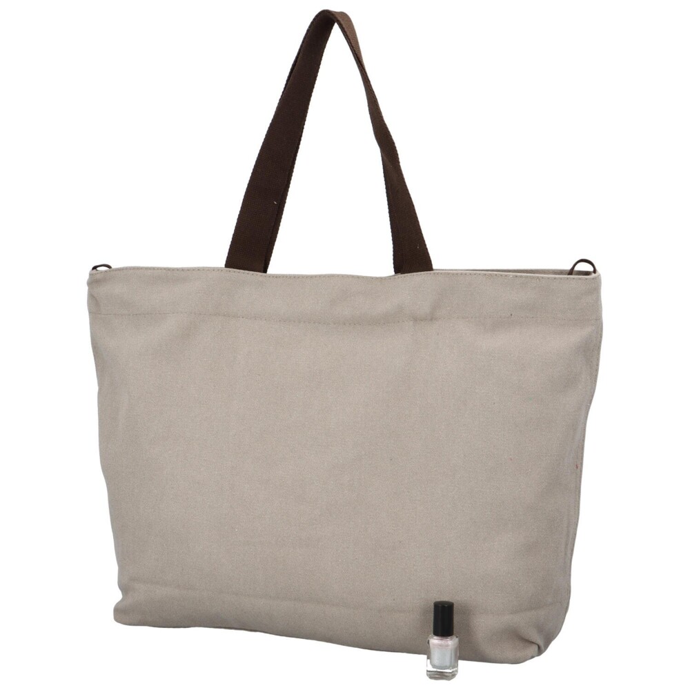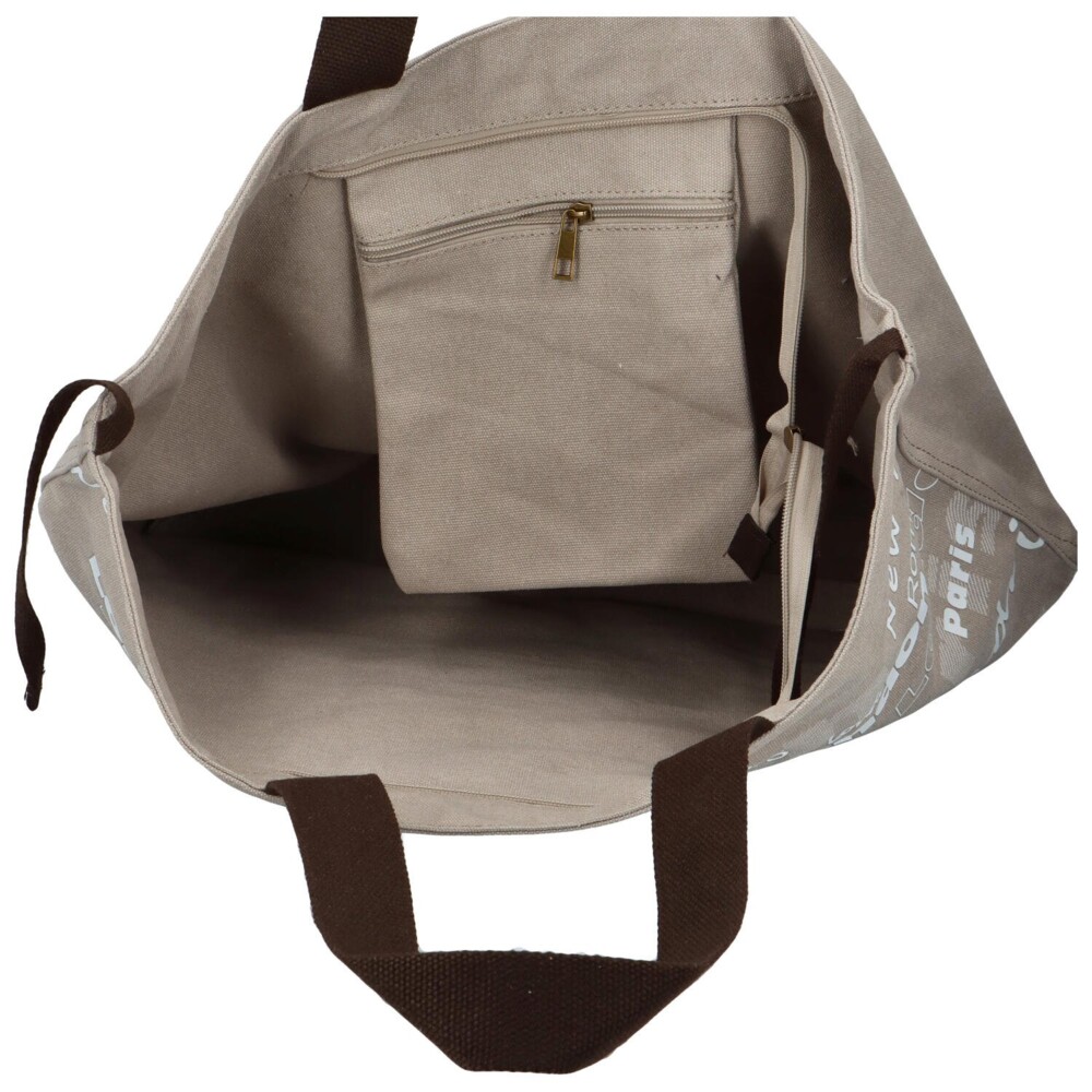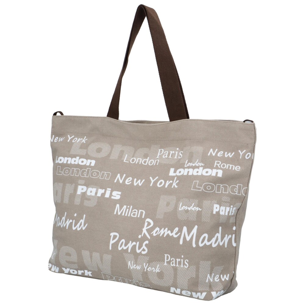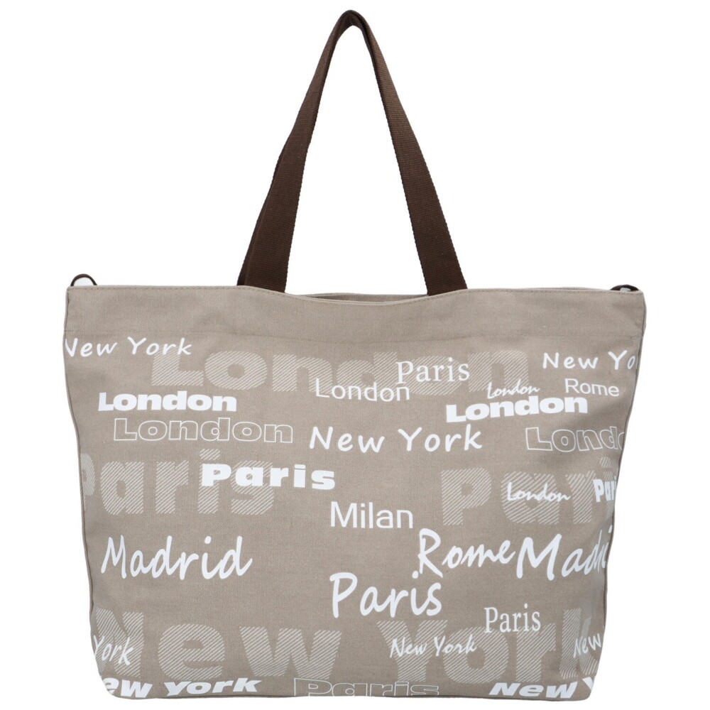 Dámská látková taška na pláž - plážová kabelka přes rameno, s dlouhým uchem a moderním designem s nápisy na šedém podkladu. Otevírá se pomocí zipu a uvnitř najdete kapsičku na zip na drobnosti, telefon či doklady. Taška nabízí prostor a trendy vzhled. Právě díky tomu ji lze využít i v létě jako nákupní tašku nebo kabelku do města!