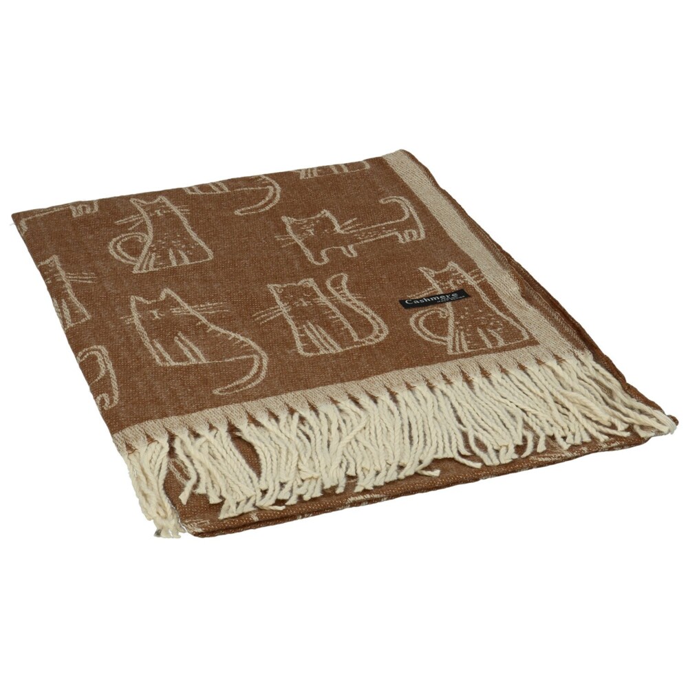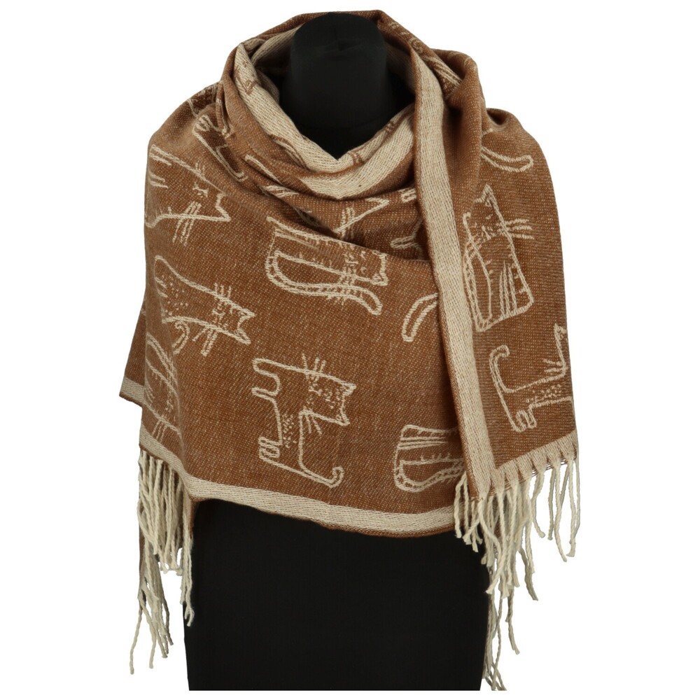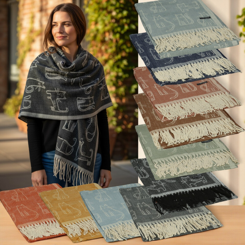 Roztomilá oboustranná šála z kašmíru s příměsí akrylu potěší všechny milovnice koček i originálních doplňků. Po celé šále ji zdobí hravý motiv koček. Z jedné strany vyniká tmavý podklad se světlými siluetami, z druhé se barvy obrátí a vzniká jemnější, svěží efekt. Bílé třásně na koncích krásně kontrastují s barvami šály a dodávají jí lehkost i šmrnc. Měkká, hebká a hřejivá, ideální společník do chladných dnů s nádechem hravé elegance. Objednejte ještě dnes a vyzkoušejte, vrátit ji můžete až do 30 dnů!