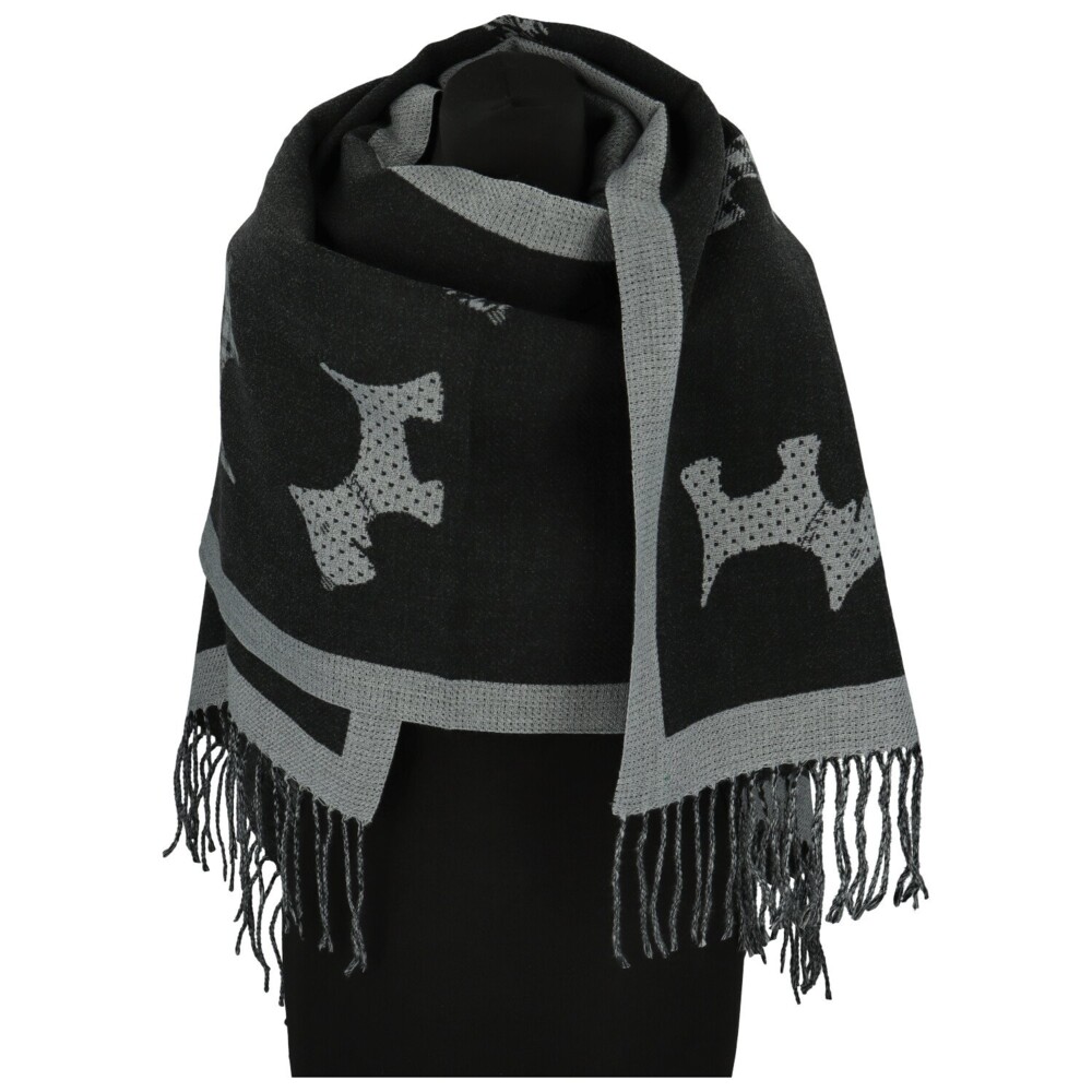 Elegantní šála z jemného kašmíru s příměsí hedvábí potěší nejen milovnice originality. Zdobí ji opakující se motiv psa, který dodává doplňku hravý, ale zároveň sofistikovaný vzhled. Díky oboustrannému provedení můžete snadno měnit styl. Jedna strana má tmavší základ se světlým vzorem, druhá naopak působí světle a jemně. Třásně na koncích podtrhují její lehkost a nadčasový šarm. Ideální pro doladění outfitu i jako stylový dárek pro milovnice zvířat. Objednejte ještě dnes a vyzkoušejte, vrátit ji můžete až do 30 dnů!