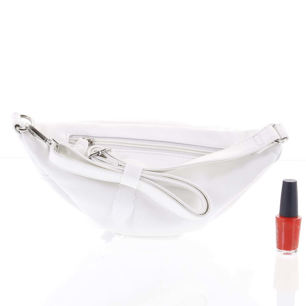 Objednejte tuto novinku na trhu ještě dnes, vyzkoušejte, vrátit ji můžete až za 30 dnů! David Jones Vám představuje dámskou módní ledvinku v bílé barvě a jemném designu. Tuto koženkovou kabelku můžete nosit kolem pasu, přes rameno nebo kolem těla, jak je to momentálně v módě. Ledvinka je akurátních rozměrů, s kovovými sponami, střapcem u zipu hlavní kapsy a logem na předním straně. Popruh je podšitý látkou. Další dvě menší kapsičky se zipy najdete na vnitřní i vnější straně strany zadní.