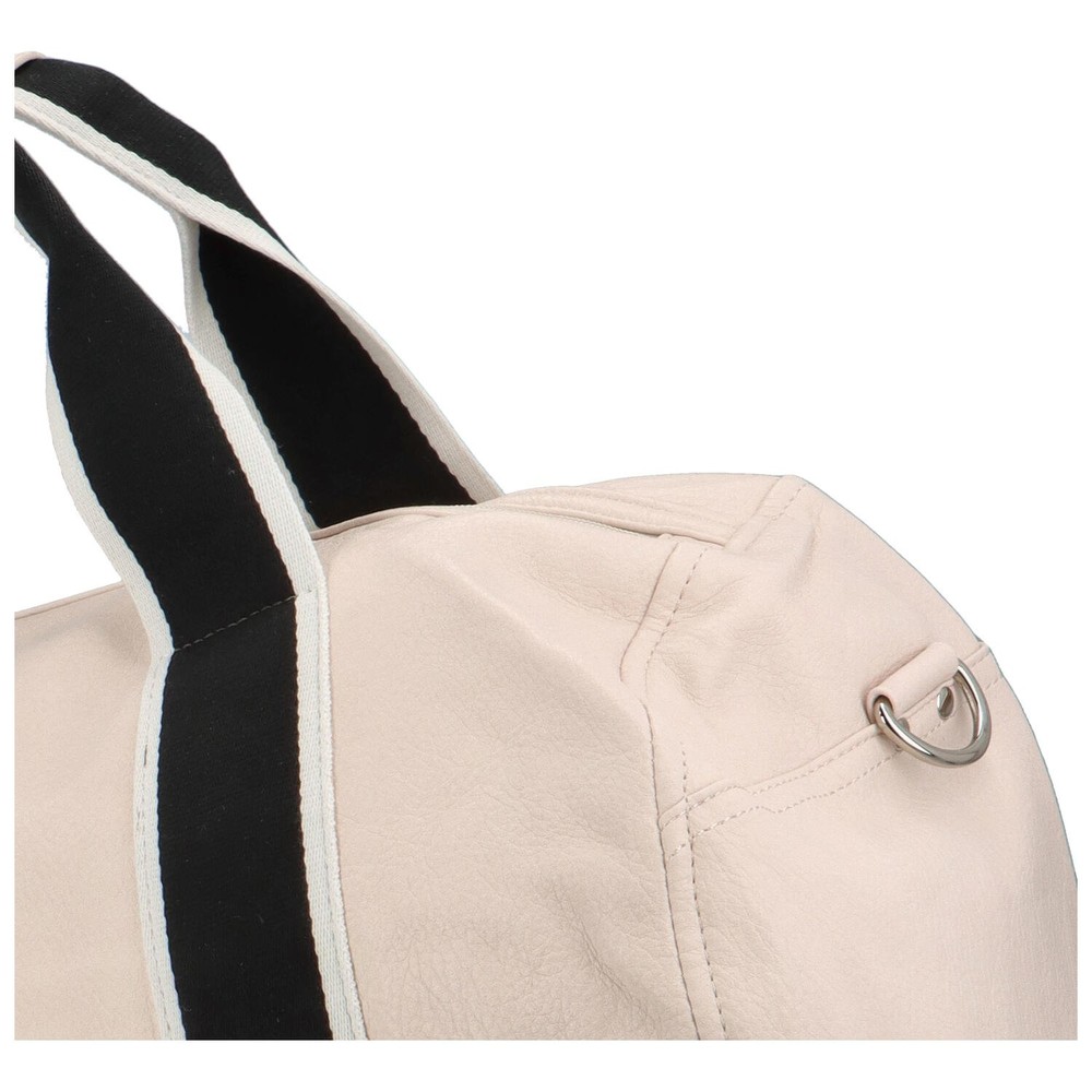 Objednejte tuto novinku na trhu ještě dnes, vyzkoušejte, vrátit ji můžete až za 30 dnů! Módně sportovní taška ve světle béžové barvě se stane ideální partnerkou do práce, do města i za sportem. Kabelka se nosí v ruce nebo přes rameno s látkovým popruhem. Je velká a proto zde uložíte vše, co potřebujete. Hlavní kapsa je klasicky na zip a samozřejmostí jsou kapsičky na drobnosti a cennosti uvnitř i vně tašky. Má krásný oválný design a šmrnc doplňuje bílo černá látka okolo. Bonusem je odnímatelný přívěsek v podobě kovové placky s logem značky na syntetickém pásku.